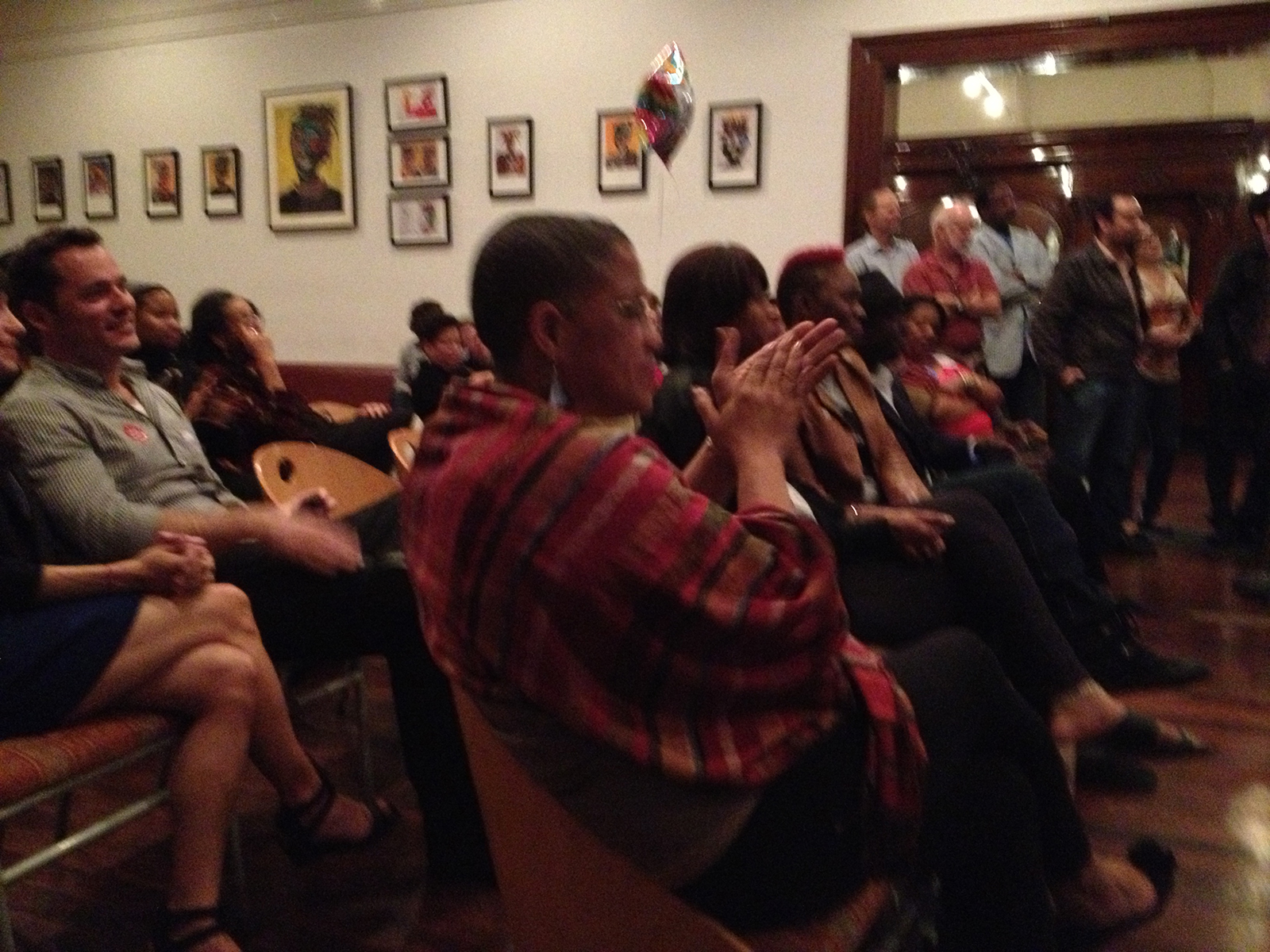 - People gathered at Barbara Parker’s watch party clap as Obama addresses the nation in his acceptance speech. Photo by .Samantha Masunaga