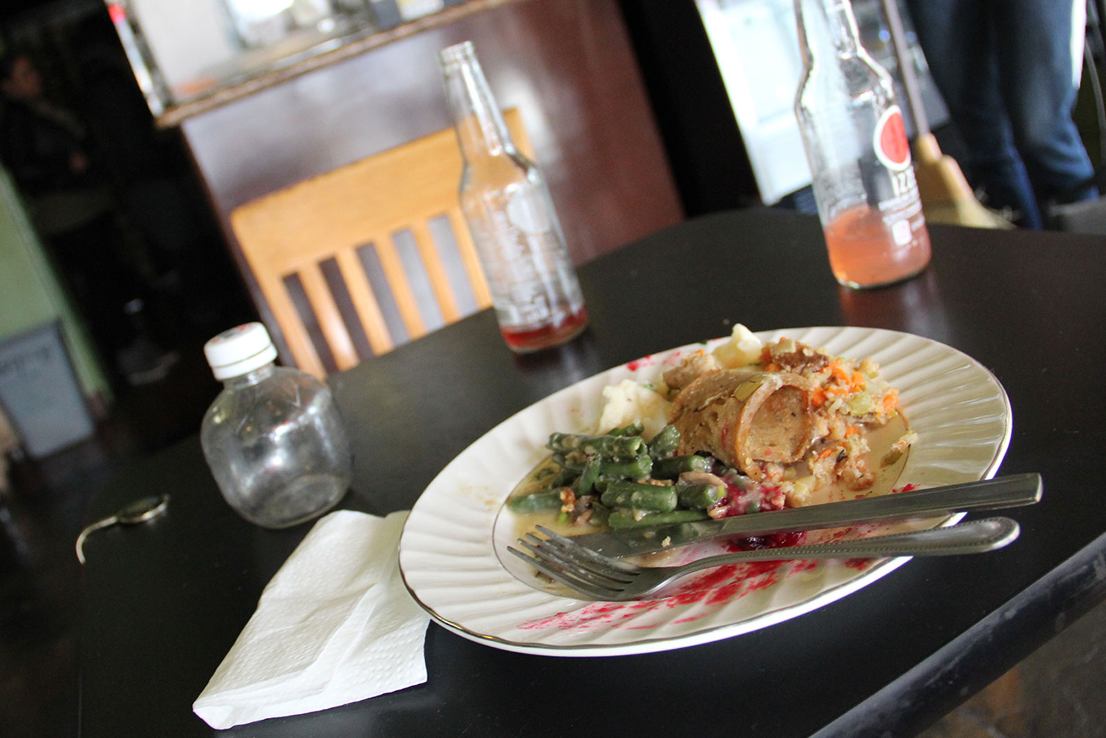 - No animals were harmed in the making of this meal: At The Breakroom Cafe on 13th Street and Harrison, the classic Thanksgiving meal is done vegetarian style. Pictured: vegetarian mash potatoes and gravy, greens, cranberry sauce, faux turkey and stuffing.