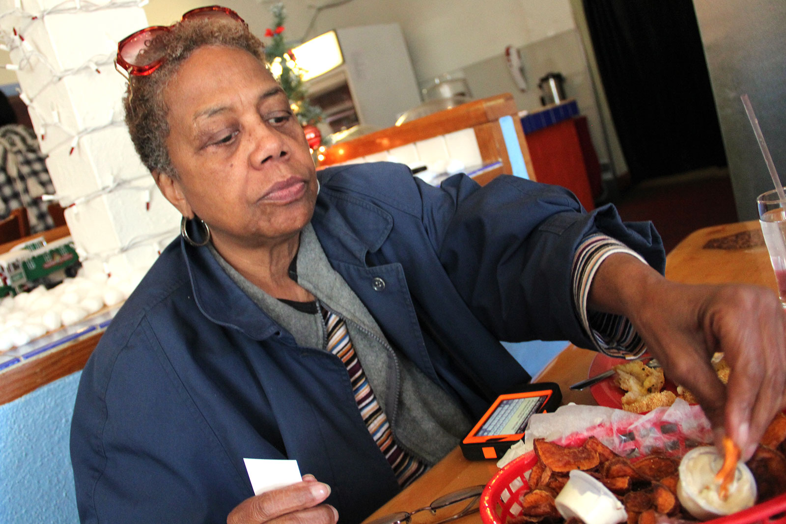 - Andrea Turner samples vegan southern fried tofu and chips and dip at Souley Vegan in downtown Oakland.
