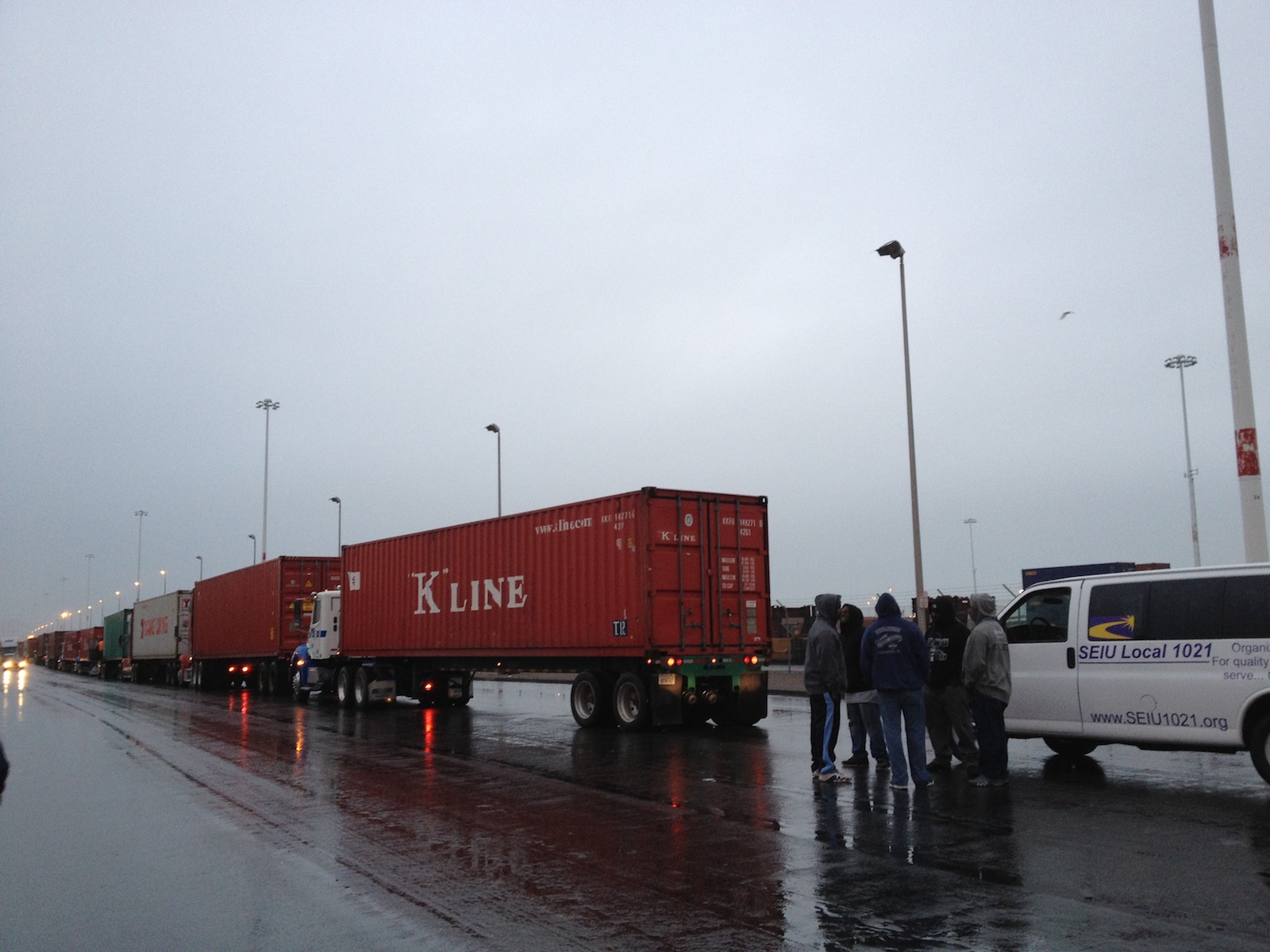 - Trucks were parked in the middle of the highway when drivers were prevented from entering the Port. Longshoremen and drivers stand in front of the van used by SEIU to transport picketers to the site.