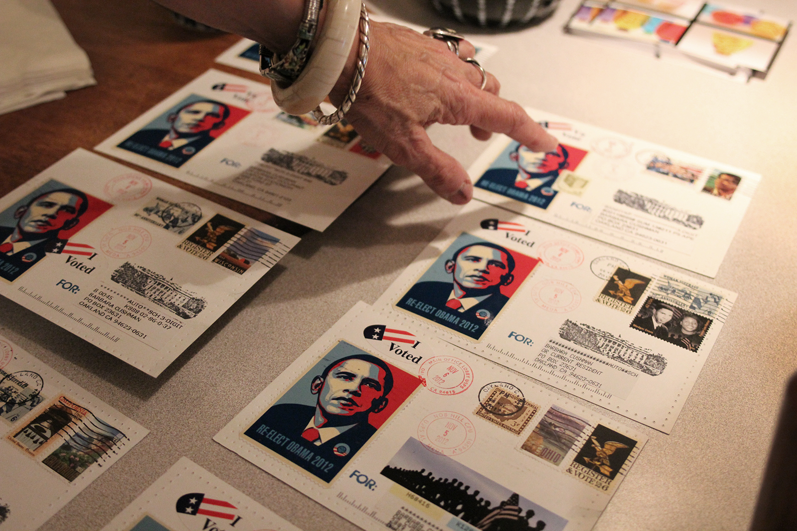 - Barbara Cushman shows her hand crafted note cards inspired by the recent election.