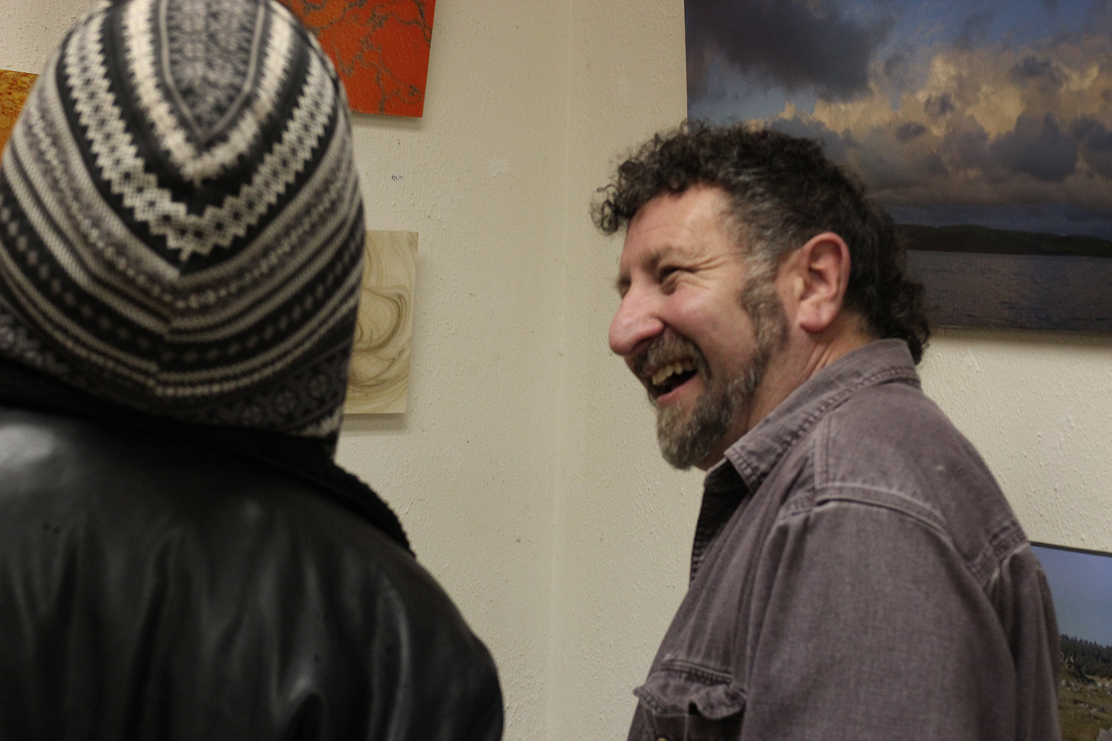 - Photographer Jon Zax shows his work to a customer in the 4:20 Gallery.