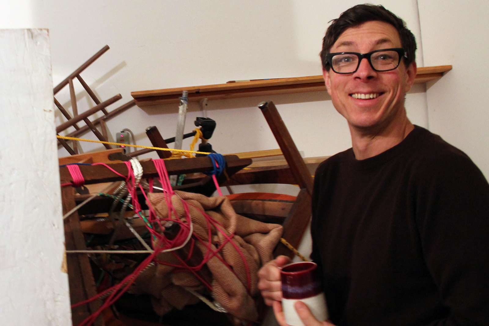 Perhaps the most interactive piece in the show comes from artist Alex Clausen, who used a multicolored assortment of string to tie together all of the contents in Clarke’s work space, incorporating the objects into a labyrinthine mass that gallery-goers can walk under using their hands and knees. “My hope with the piece at MacArthur was to create a space that you can hopefully live in or sleep in, sort of an impromptu shelter,” Clausen says. “It’s not just an art object that you can look at. It can be experienced.”