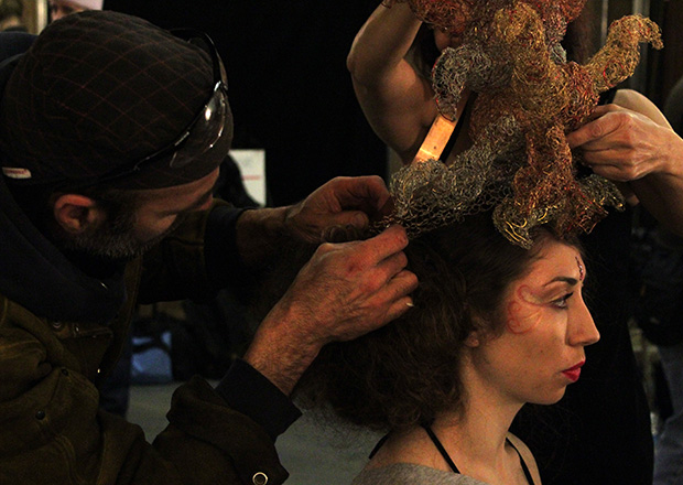During Thursday night’s dress rehearsal, the sounds of hammering and metal on metal provided an appropriate backdrop to the black runway, lofted off the concrete floor by compact aluminum pylons, and lit by two flaming chandeliers that floated above the stage. The catwalk’s centerpieces of silver twisted metal were lit with red lights, as if they were on fire. Actual flames burst periodically from them, briefly illuminating the runway and models with red flashes of fire. Everything was black and red, metal and fire—as if the audience would be entering a forge where the models were being welded together and hammered into the shape of the show’s creations.