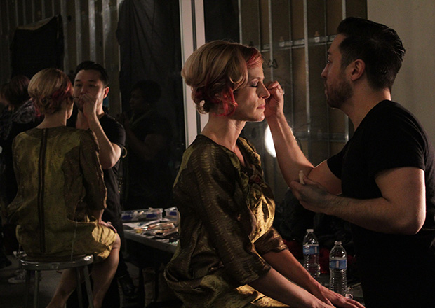 - Models have their hair and makeup done upstairs before the show, and dress for the runway.