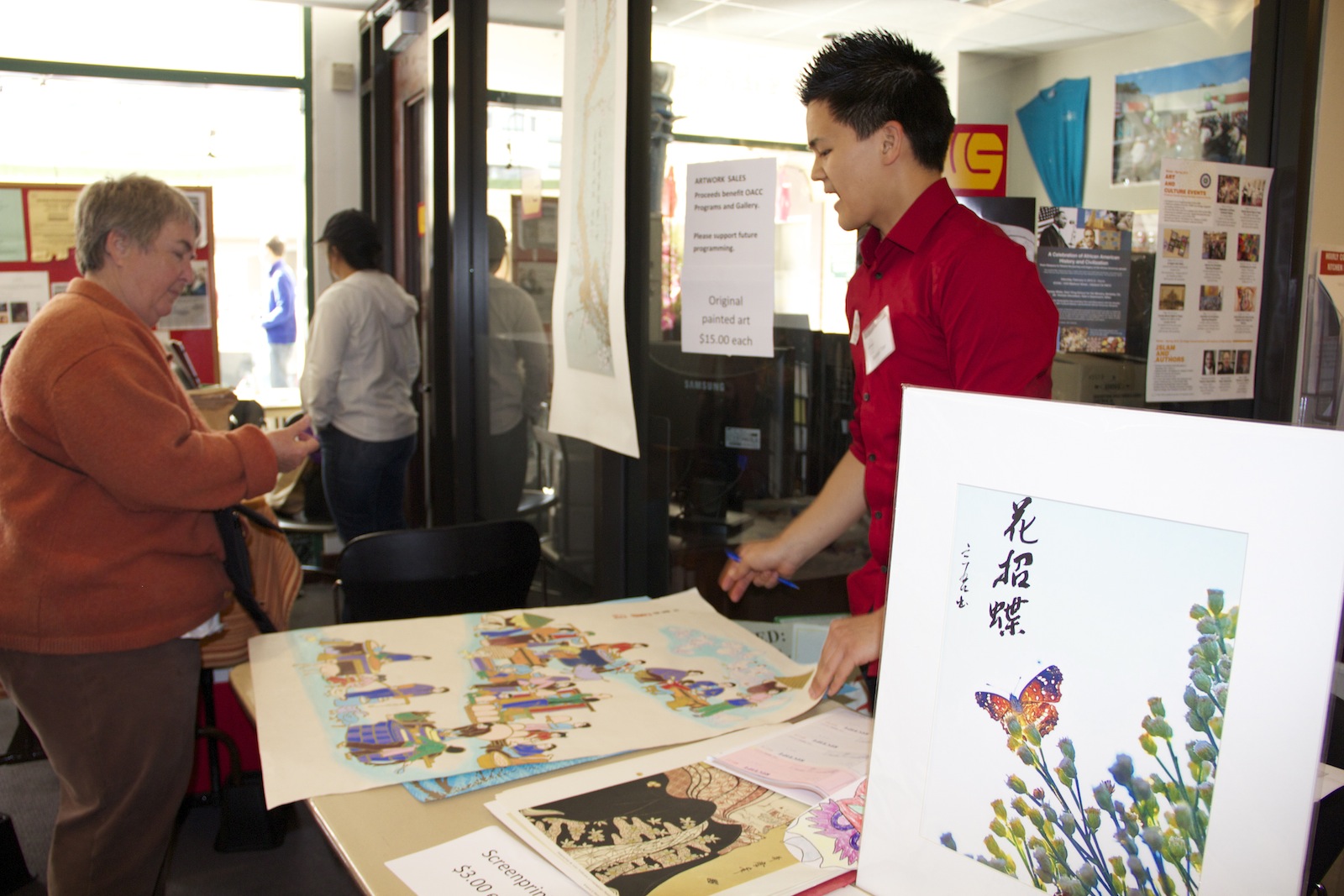 On display in the center of the room was artist Nancy Hom’s Mandala project, which was created with family heirlooms and cards decorated by Oakland residents. The Mandala is used to represent a model for the structure of life. The one created by Hom represents the city of Oakland and its richness as a community that encompasses many people and cultures. It included ceramic pieces donated by friends and members of the community. Cards created by visitors who arrived at the festival helped to make the circle grow as each card was added to the project