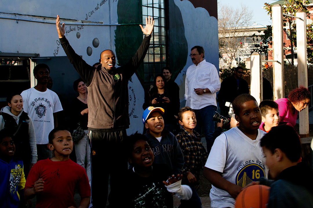 - Landry plays basketball with kids on the playground at the East Oakland Boxing Association.