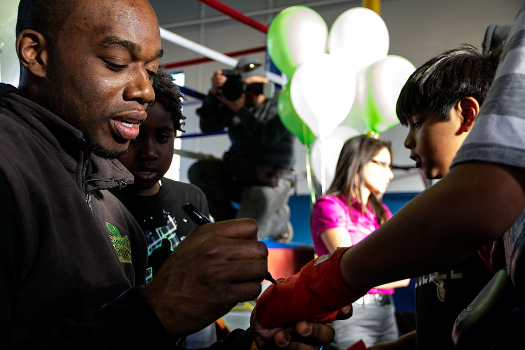 - Warriors forward Carl Landry autographs a child’s hand wrap at the East Oakland Boxing Association on Thursday Feb. 21, 2013. Landry joined representatives from Good Sports, a non-profit that distributes sports gear to kids, in donating funds for new gear to EOBA.