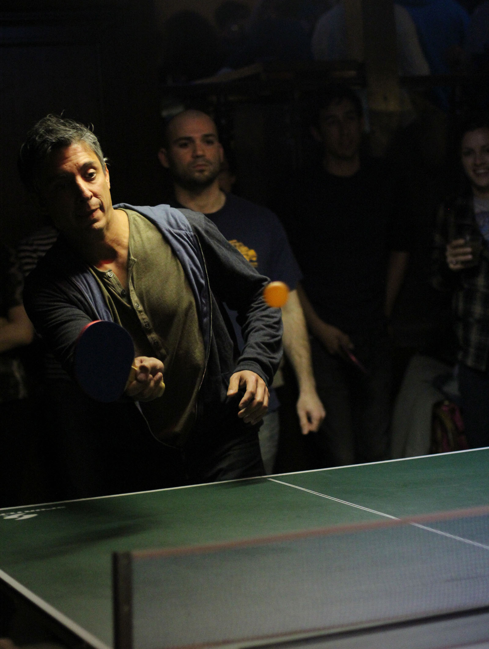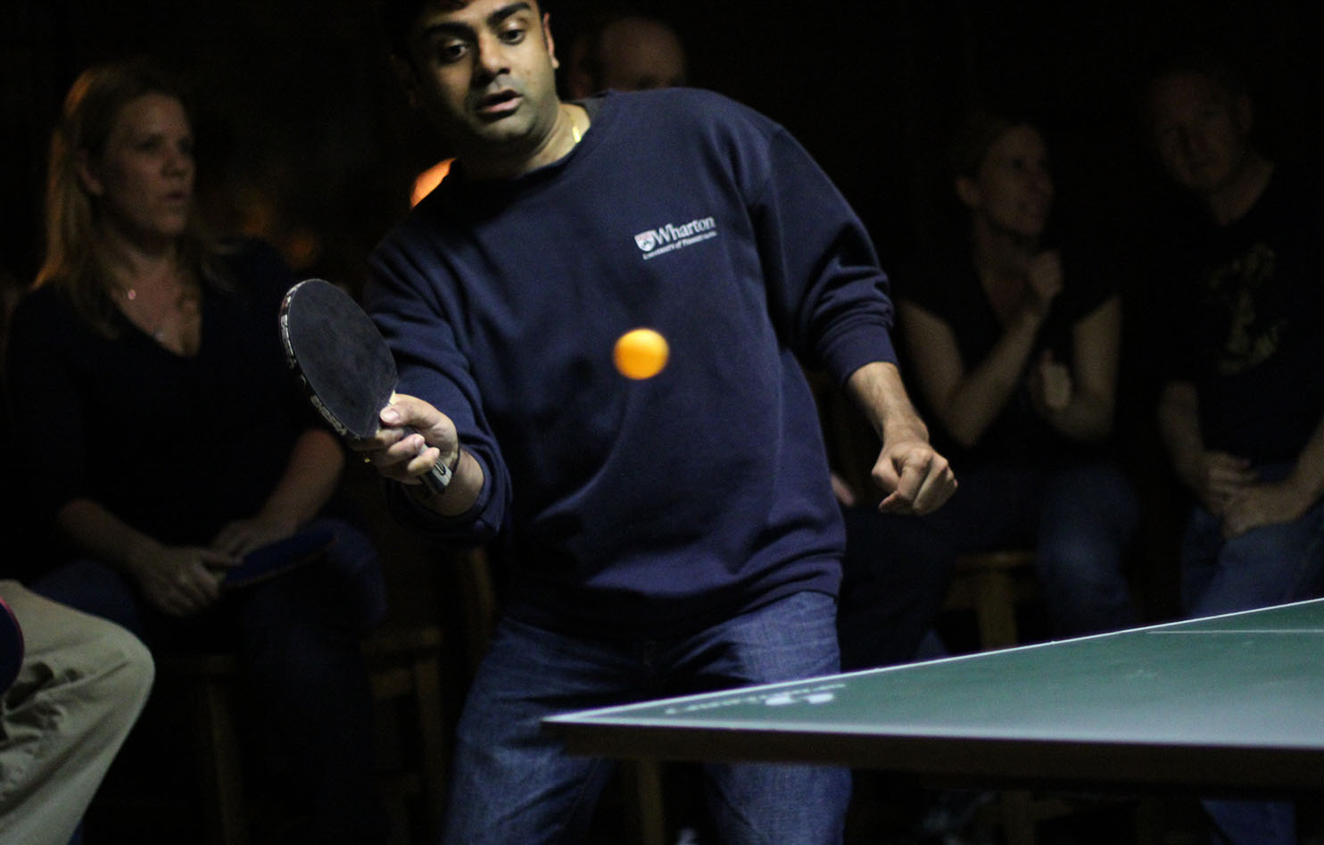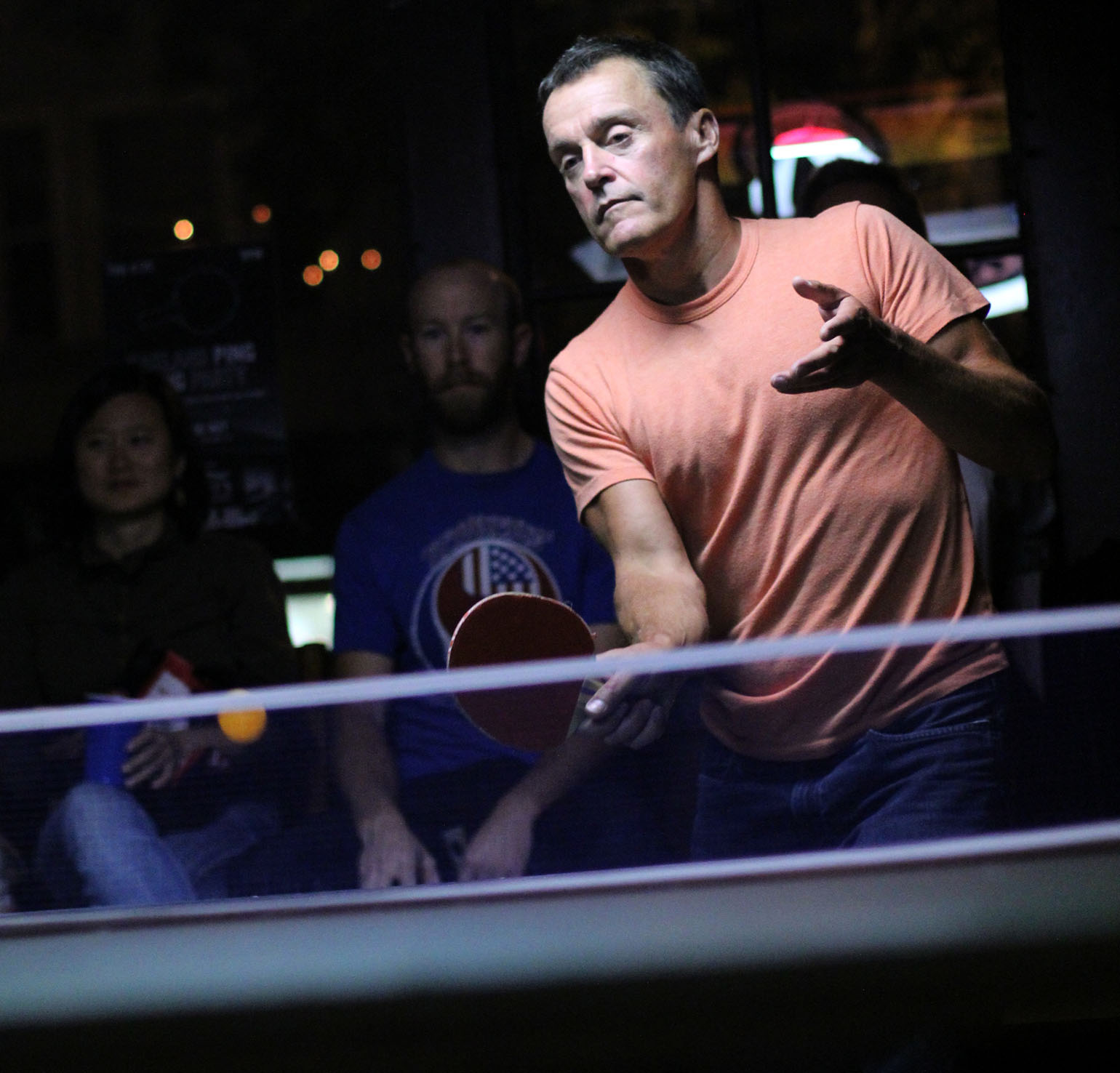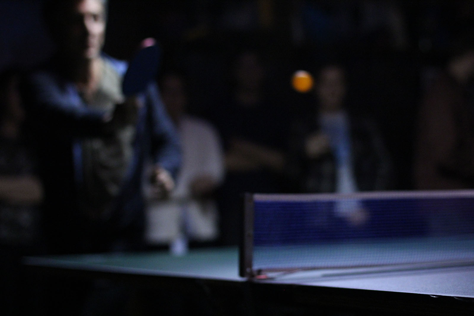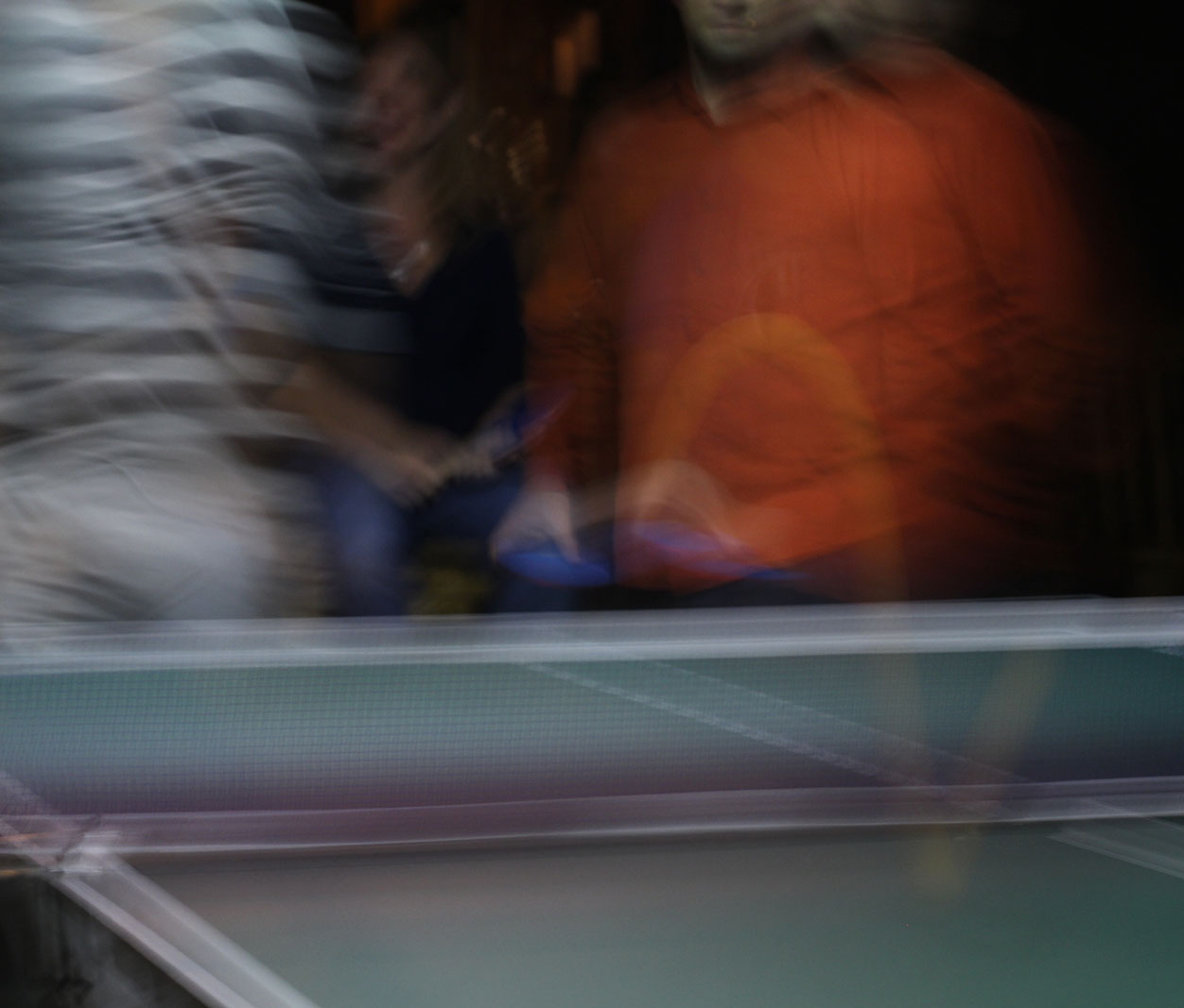 - An orange ping pong ball is smashed to the other side of the table. Photo by Sean Greene.