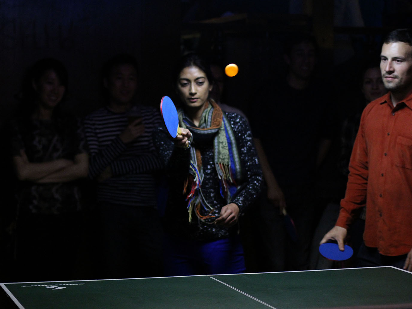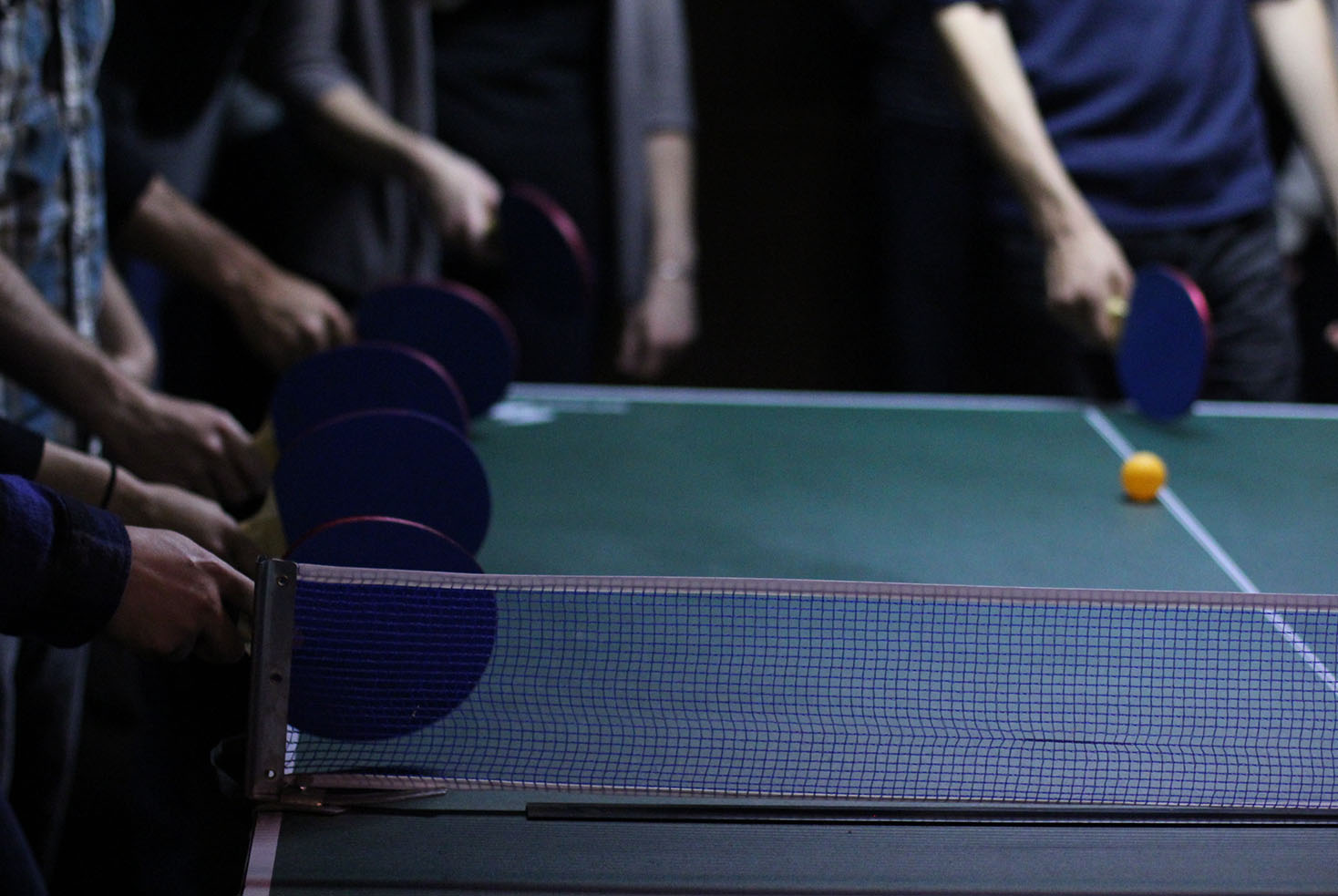 People who want to join the game grab a paddle from the box and squeeze into the line of participants who are gathered around the table. On Thursday night at Ye Olde Hut, that meant at least thirty people were circled around the table. The first player serves and immediately afterwards walks his way over to the other side of the table. In the meantime, the person who is waiting on the other side hits the ball back and then switches sides. Like this, a line of players circles around the table, waiting for their turn to hit the ball back to the other side. If you mess up, you’re out of the game.