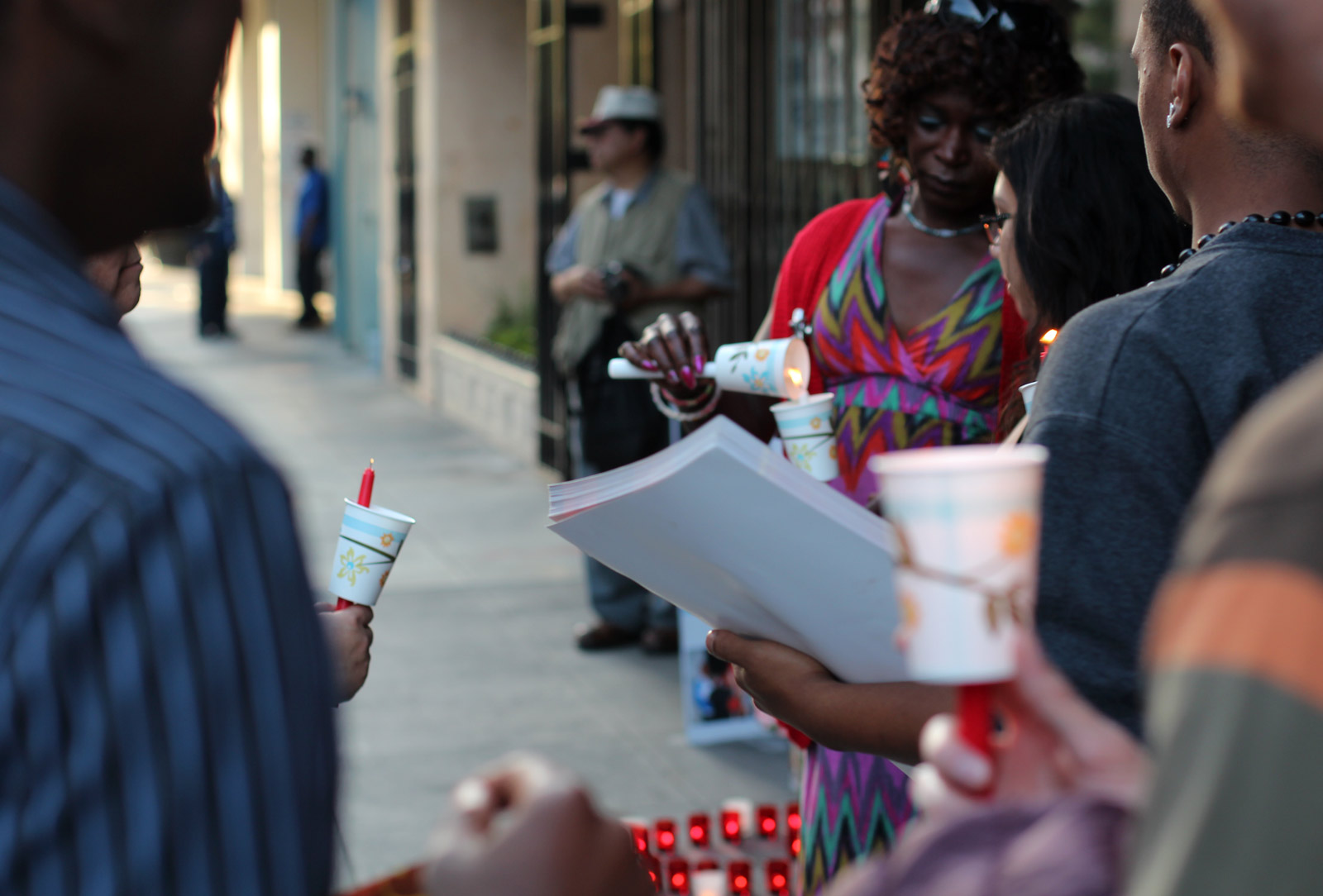 Several dozen people gathered at Monday’s vigil, lighting votive candles around a shrine of photos and roses honoring her life. Many attendees were close friends and former colleagues of Martell’s. They spoke to a gathering crowd about her work as a peer advocate with TransVision: