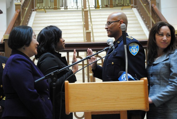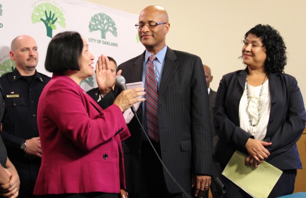 - Howard Jordan being sworn in as Oakland’s Interim Police Chief by Mayor Jean Quan, October 2011. Photo by Monica Cruz Rosas