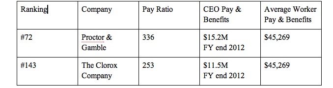 In recent years, executive pay has risen dramatically compared to the average American worker’s wage, which was about $34,645 in 2012. According to Clorox’s latest proxy statement, Knauss received $11,458,389 in total compensation in 2012 – that’s 331 times the average worker’s pay. Some investment banking firms award their CEOs much higher salaries, as much as 500 times the average worker’s pay.