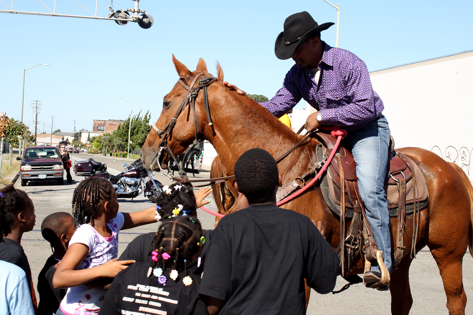 - A member of the Oakland Black Cowboy Association stops on the parade route in West Oakland to greet children.