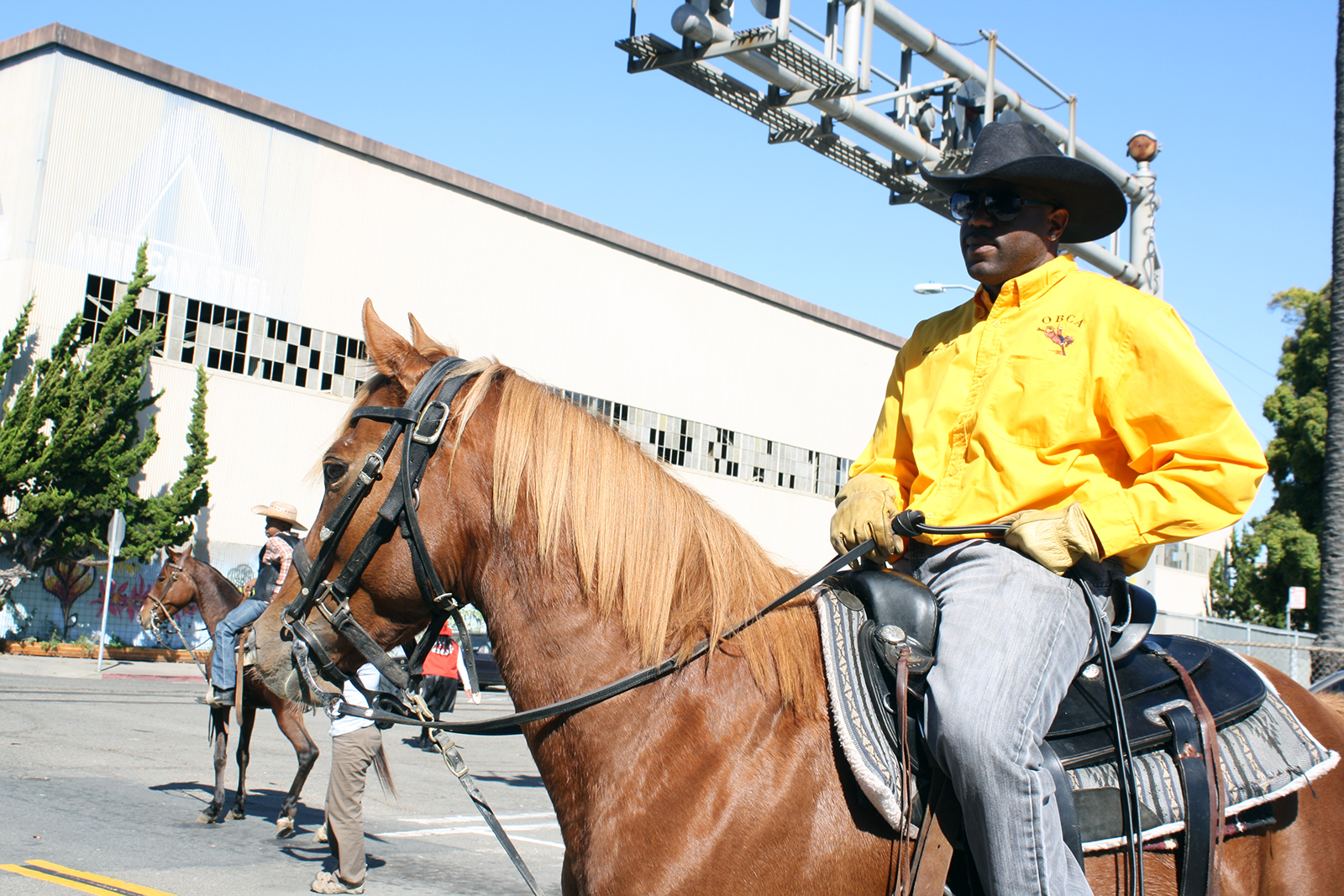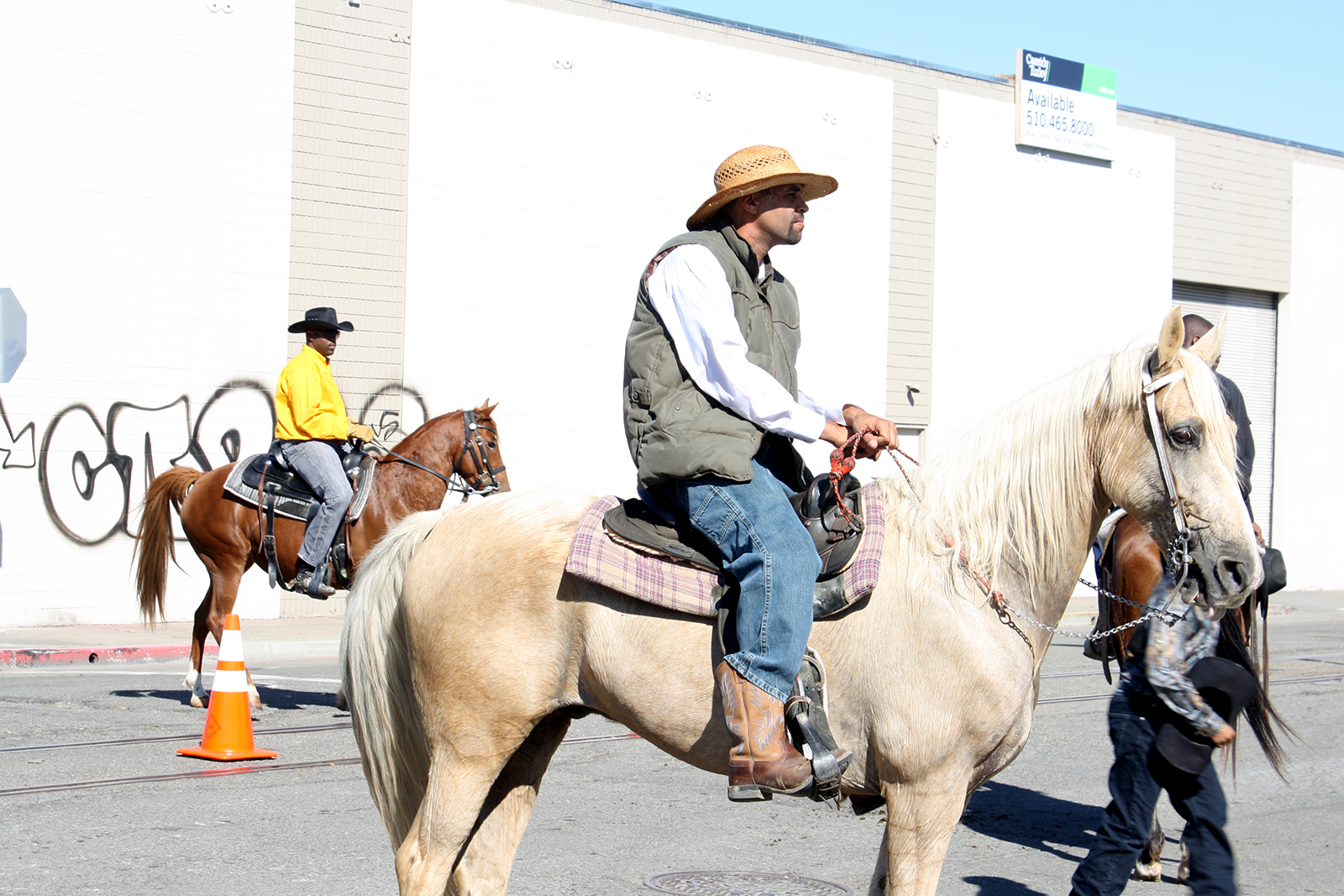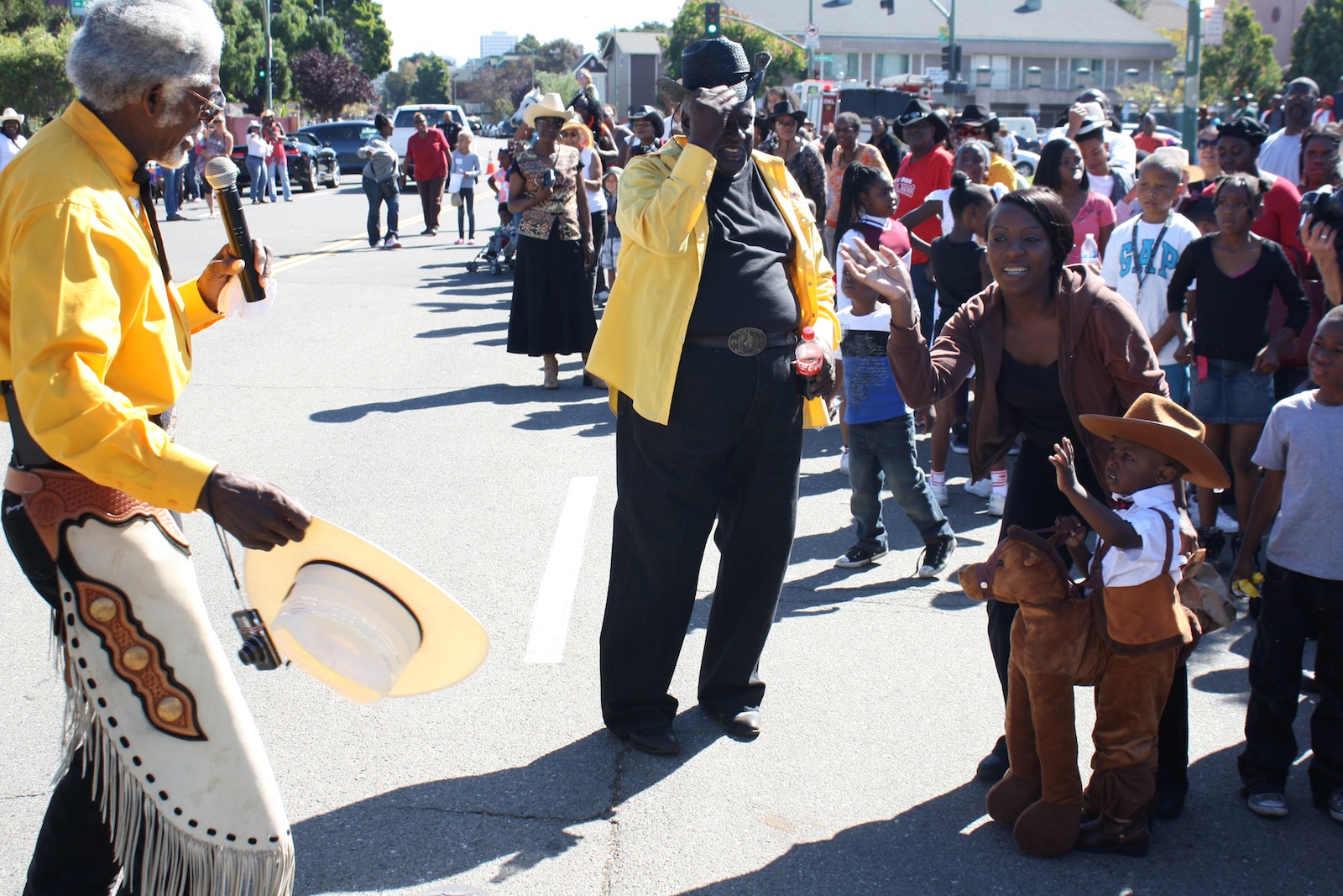 A black horse pranced down the street, following commands of its rider who reigned it away from cheering spectators. Gripping the microphone, emcee Wilbert McAlister, the president of the Oakland Black Cowboy Association, cajoled the horse to show the audience its tricks.