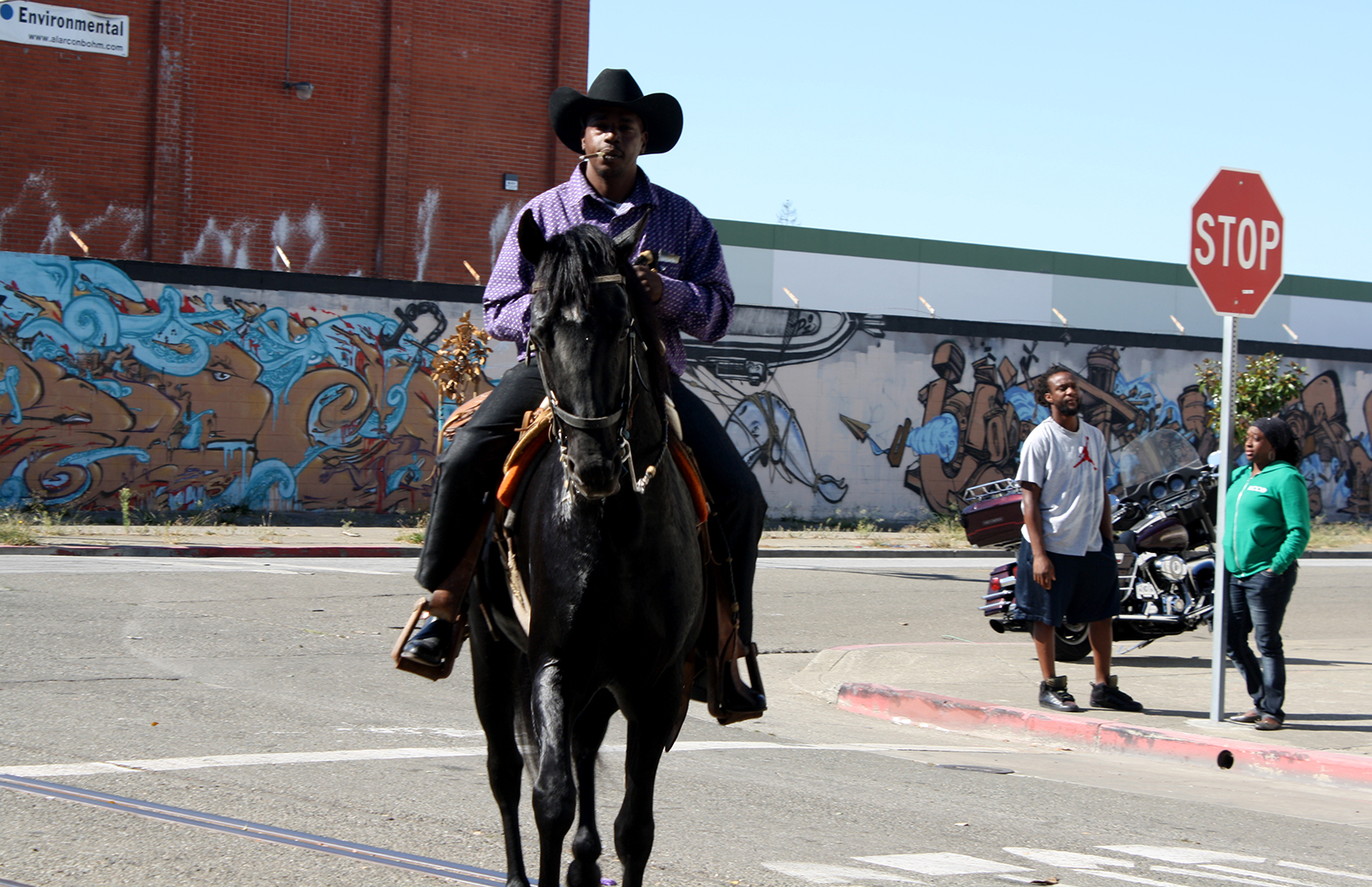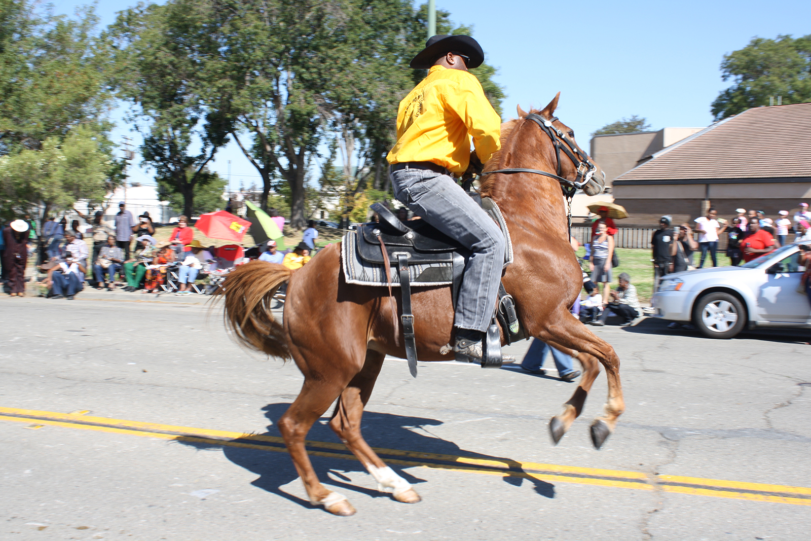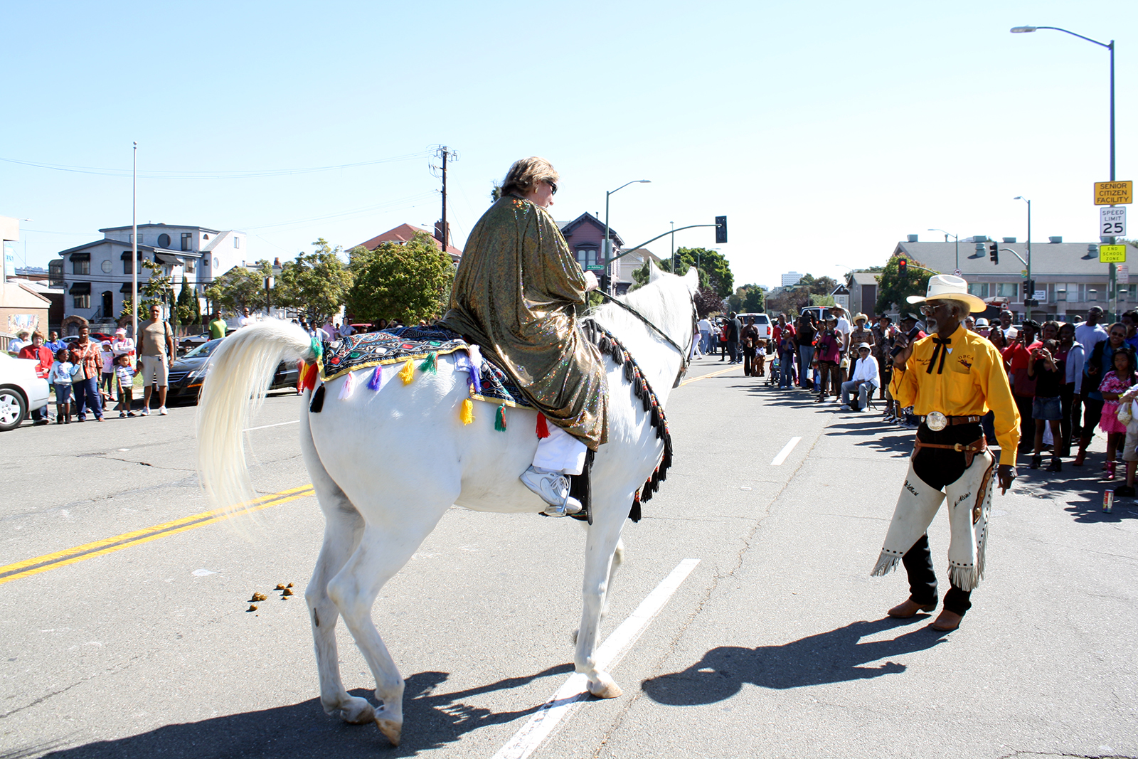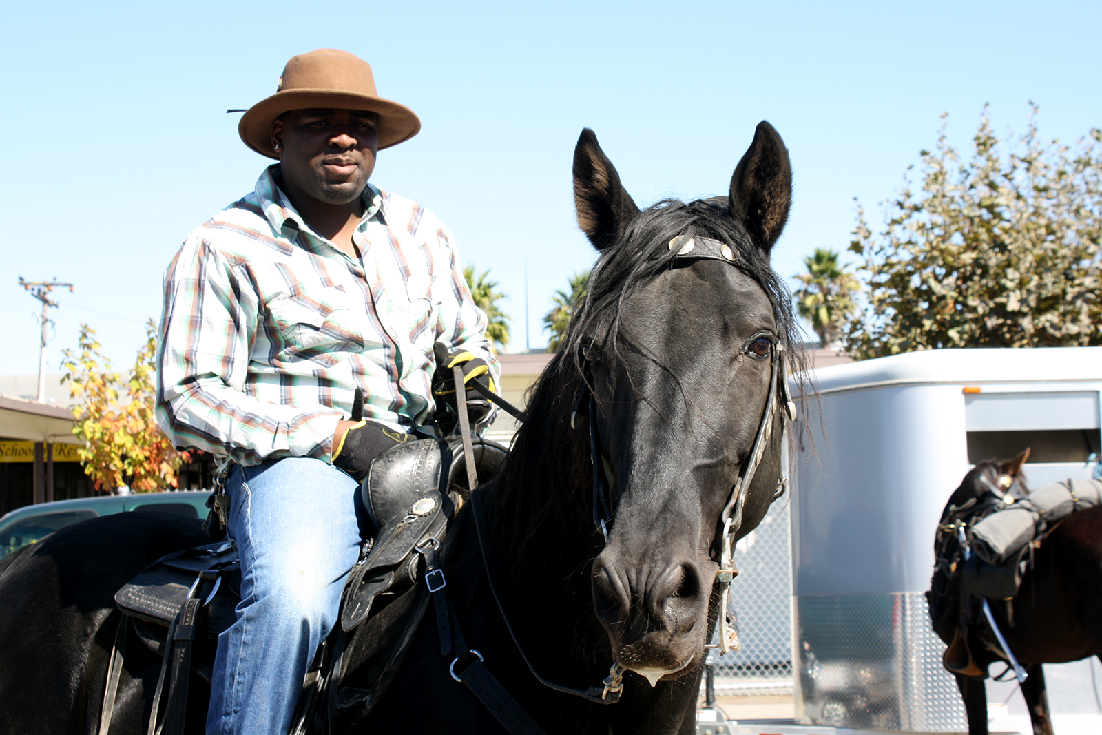 A black horse pranced down the street, following commands of its rider who reigned it away from cheering spectators. Gripping the microphone, emcee Wilbert McAlister, the president of the Oakland Black Cowboy Association, cajoled the horse to show the audience its tricks.
