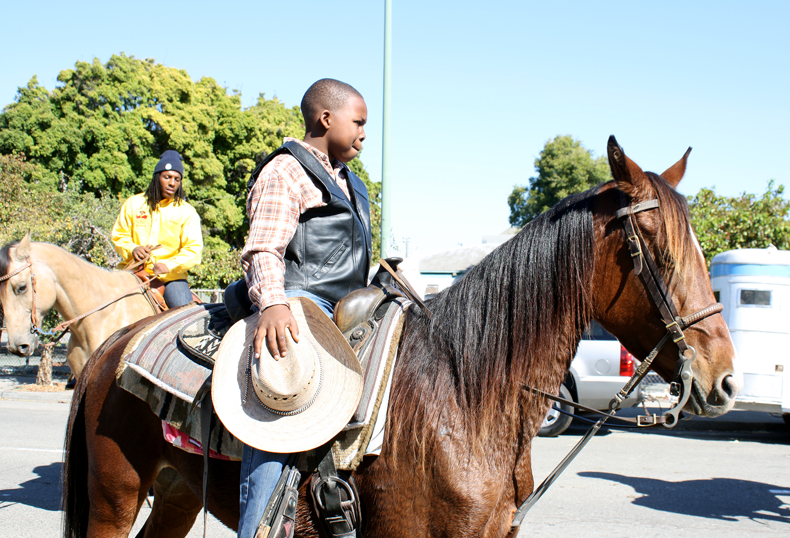 - Participants in the 39th Annual Oakland Black Cowboy Association parade and festival look at the parade route ahead.