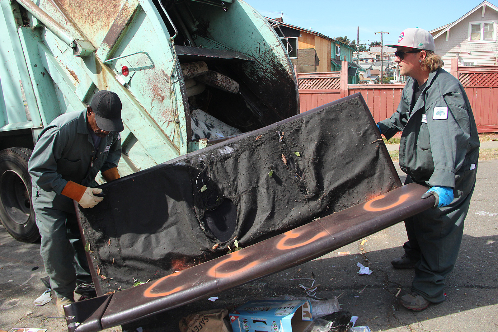 - Johnny Jackson and Peter Dunlap lift an abandoned couch into their Public Works dump truck.