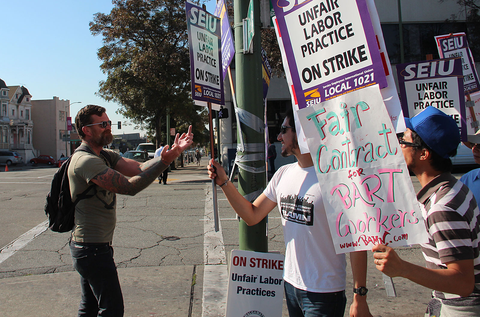 - An angry passerby gestures to BART strike supporters at the Lake Merritt BART rally. Photo credit: Max Levenson