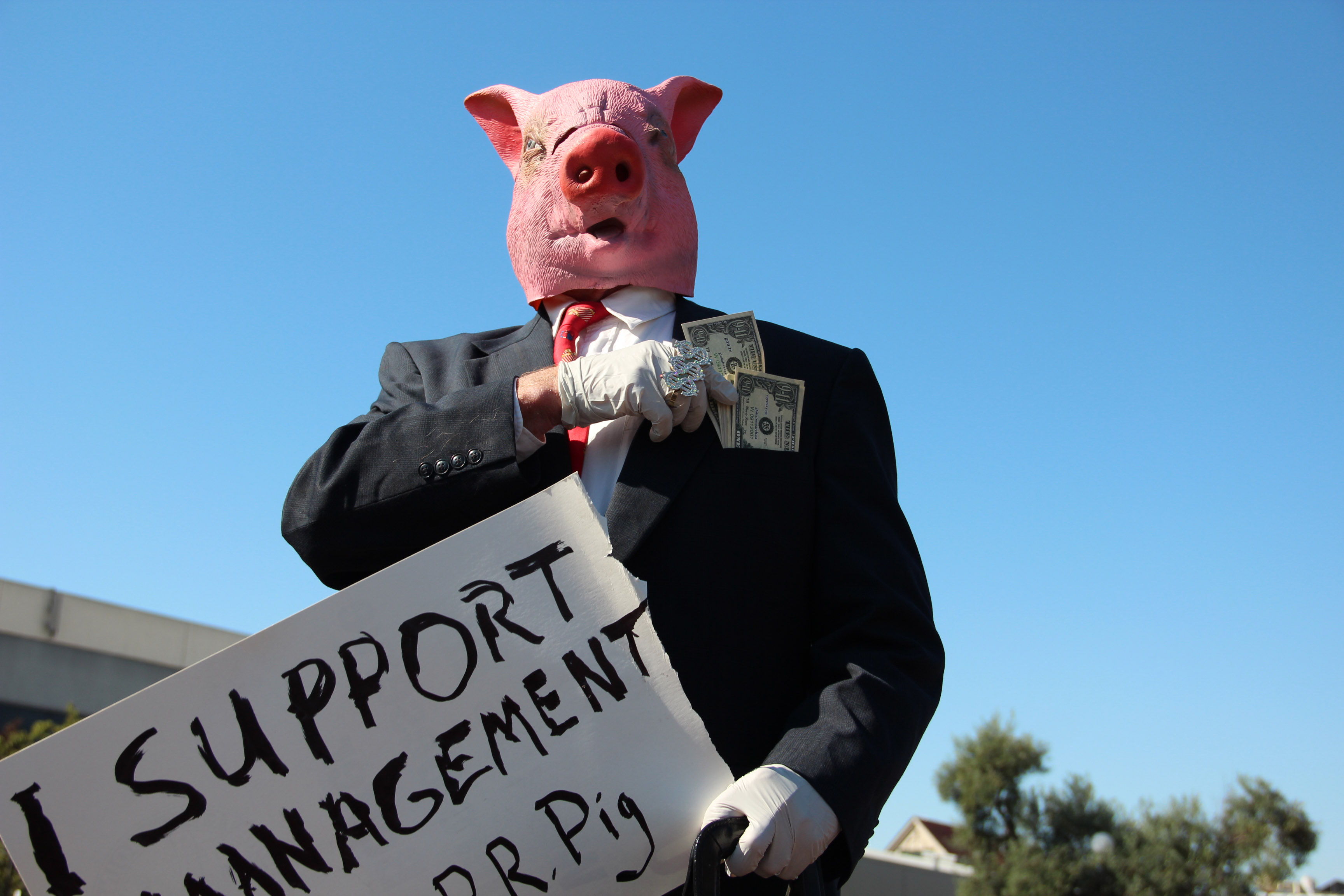 Union members, who held picket lines throughout the bay, including one central picket rally at Lake Merritt BART at noon today, were met with a mix of support and insults from onlookers. One man dressed as a pig with money stuffed in his pocket and a sign that read, “I support management. –P.R. Pig” and a briefcase that read, “Special interests.”