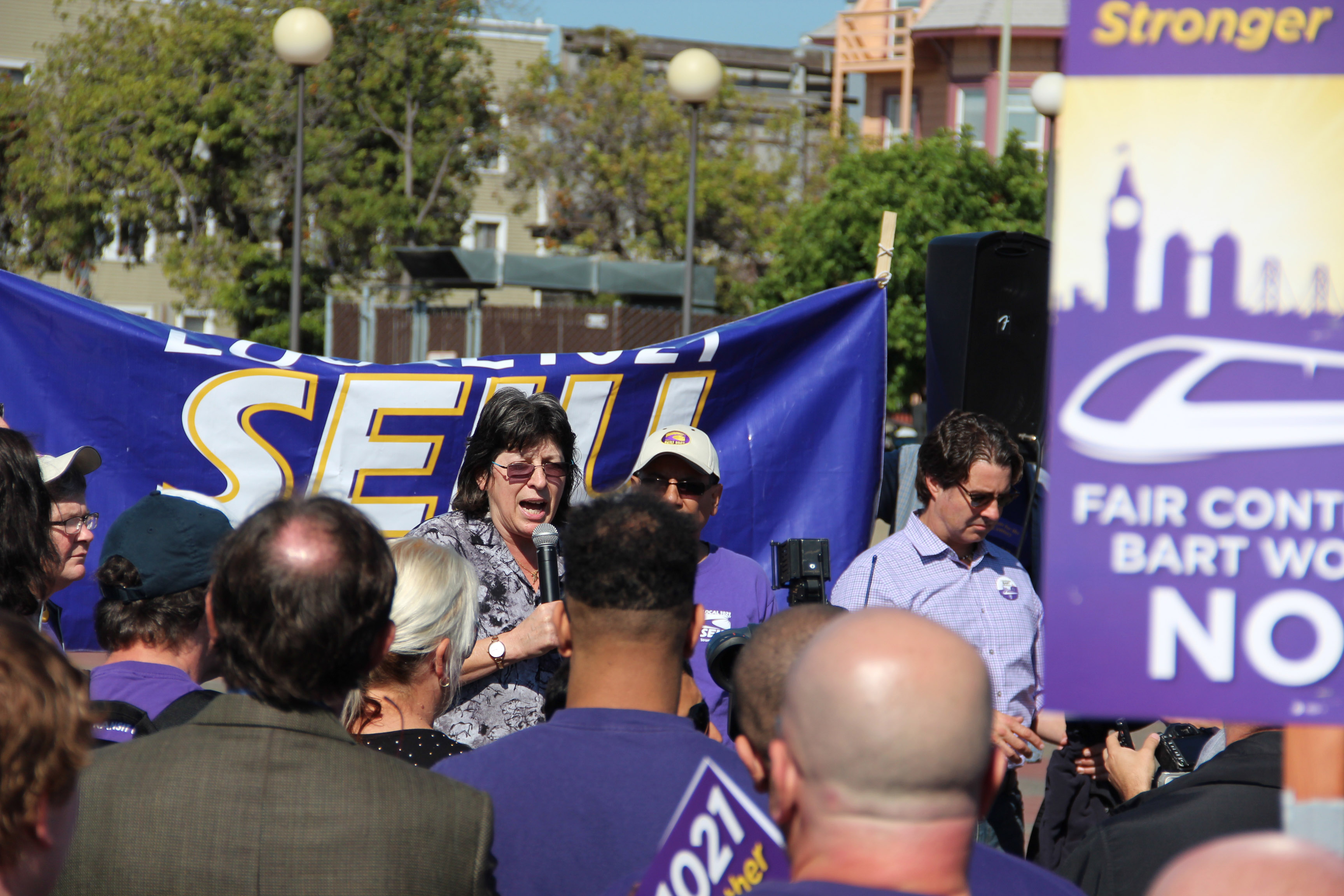 - SEIU Local 1021 president Roxanne Sanchez addresses a group of union supporters at the BART strike rally held at noon on Friday. Photo credit: Max Levenson