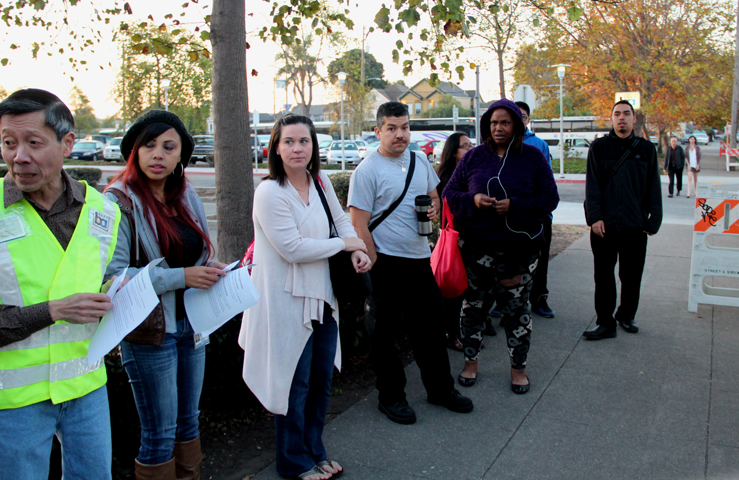 - Unsure if there will be another bus to San Francisco, commuters anxiously line up in front of the West Oakland BART station just before 8 o’clock. Photo credit: James Reddick