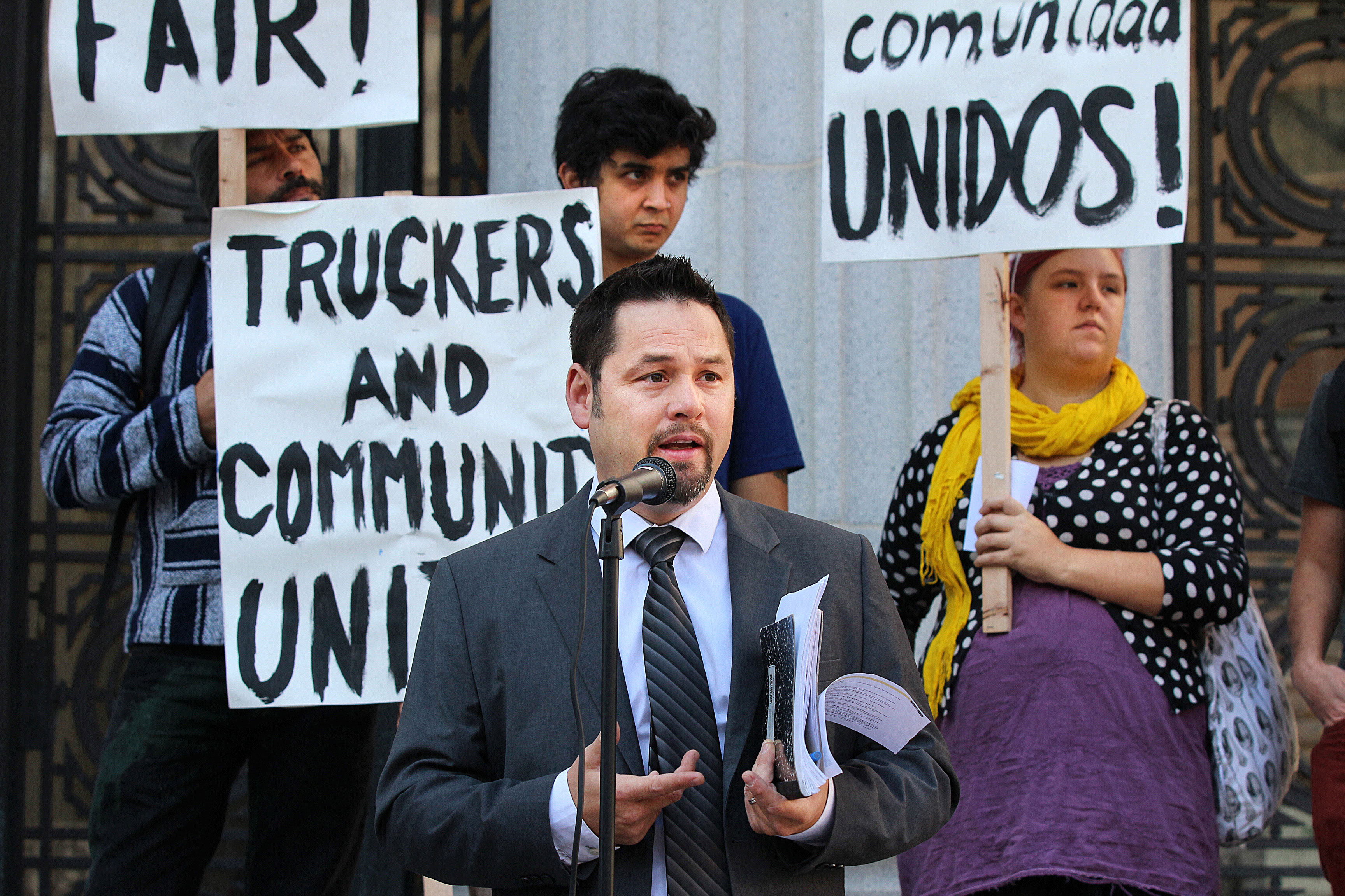 - Frank Adams, of the Port of Oakland Truckers Association, spoke to the press before meeting with state and local officials in Oakland City Hall on November 13. Photo by Terray Sylvester