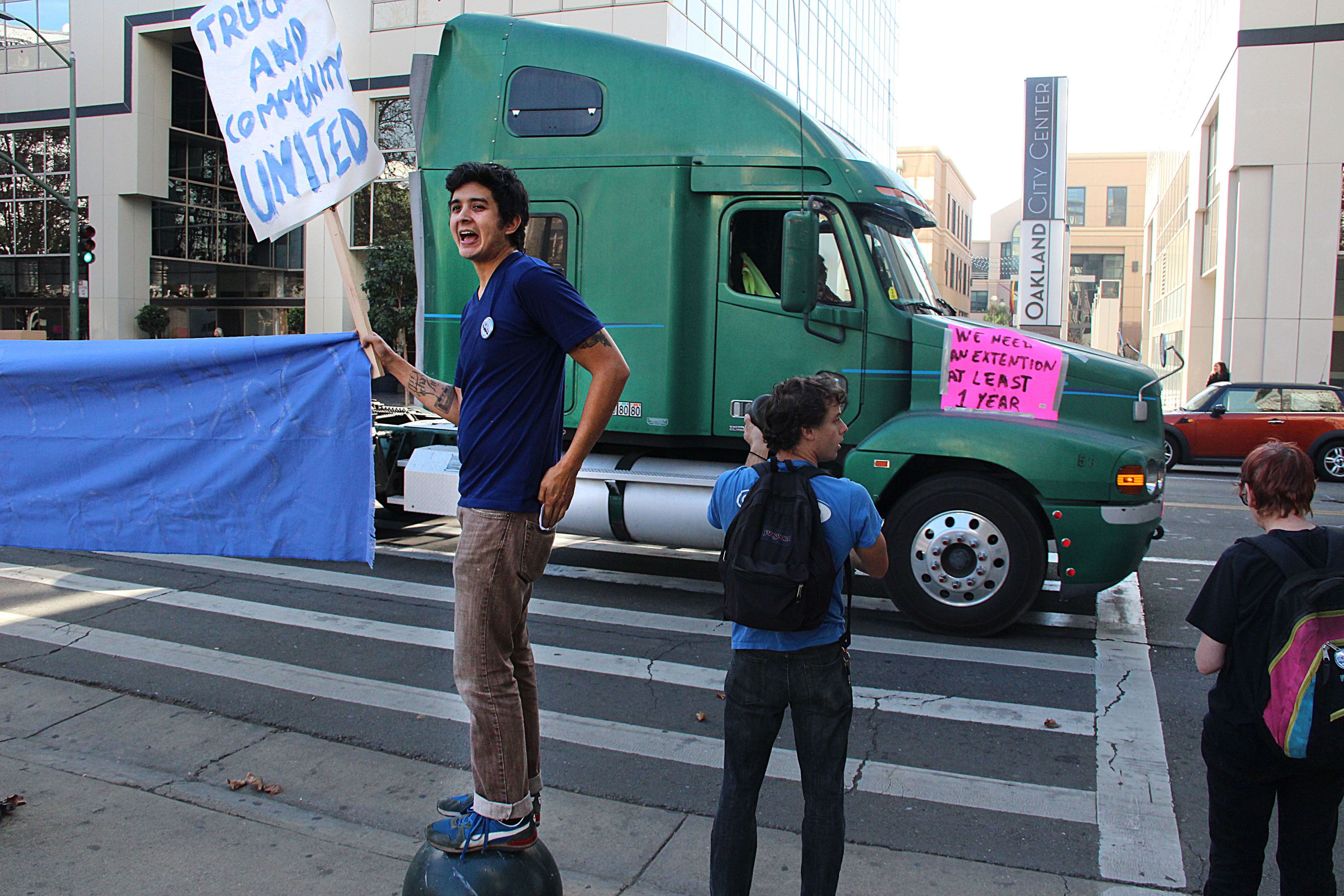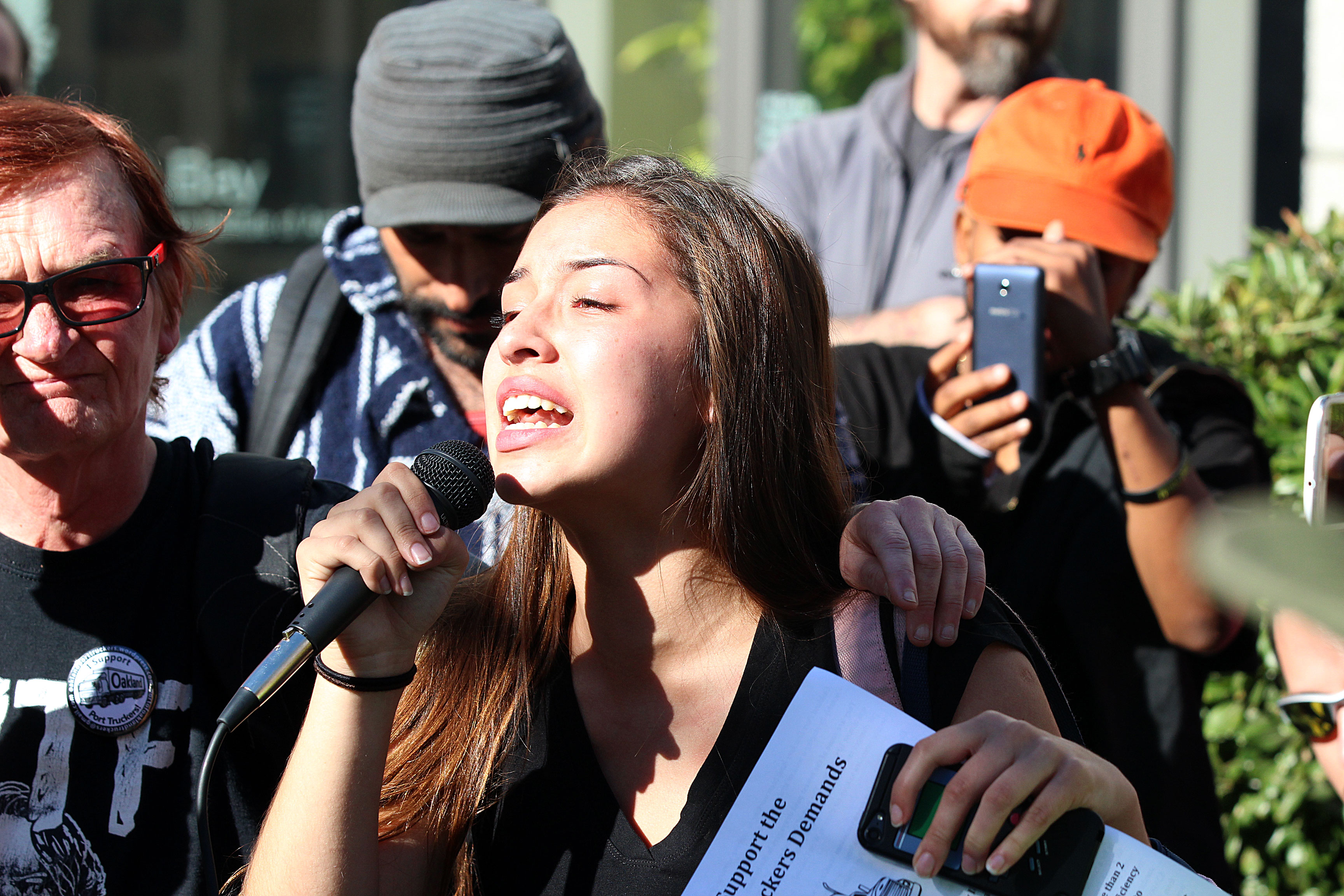 When Oakland Police attempted to issue a citation to one of the truckers, a crowd of activists responded with a PA system and chants of, “Tear up the ticket!” A crowd gathered and Camila Ramos, 15, who had ducked out of high school in Alameda to support her father, a trucker, grabbed the microphone and began berating the officers. In the end, no citations were issued.