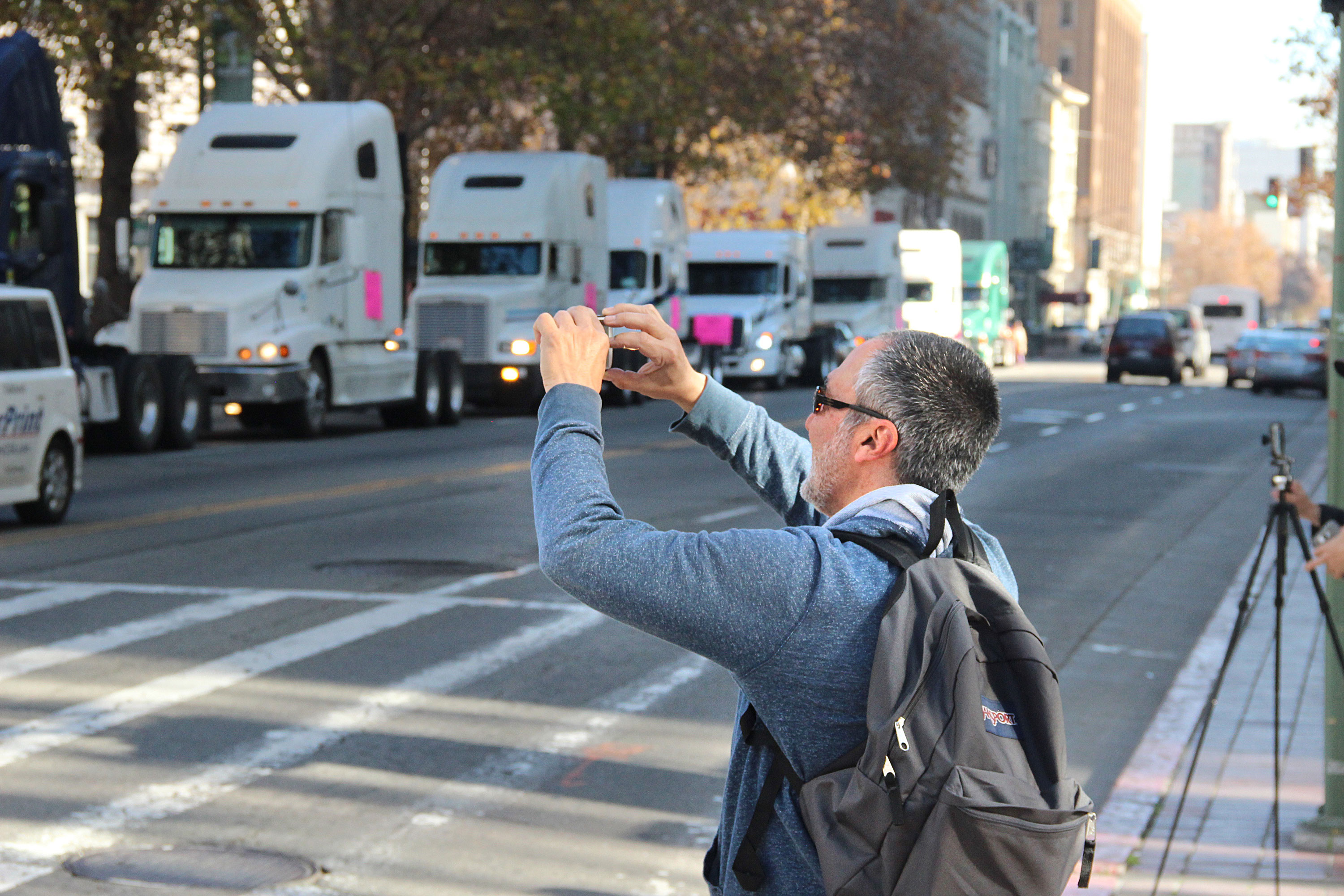 - Passersby recorded the moment as Port of Oakland truckers demonstrated in City Center. Photo by Terray Sylvester
