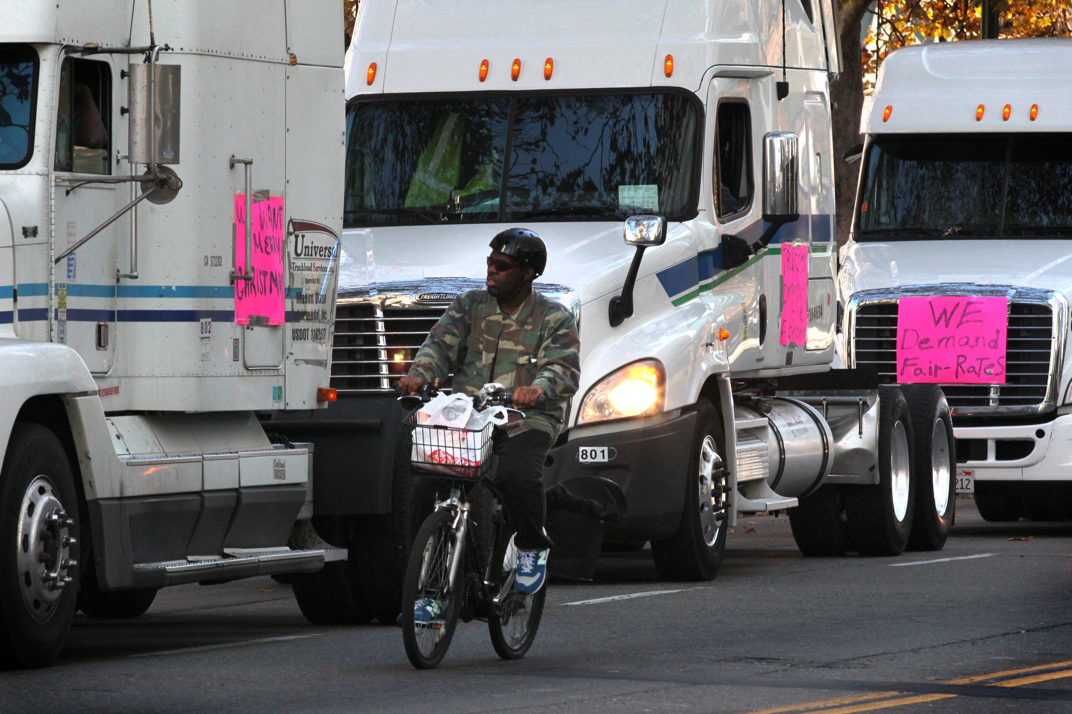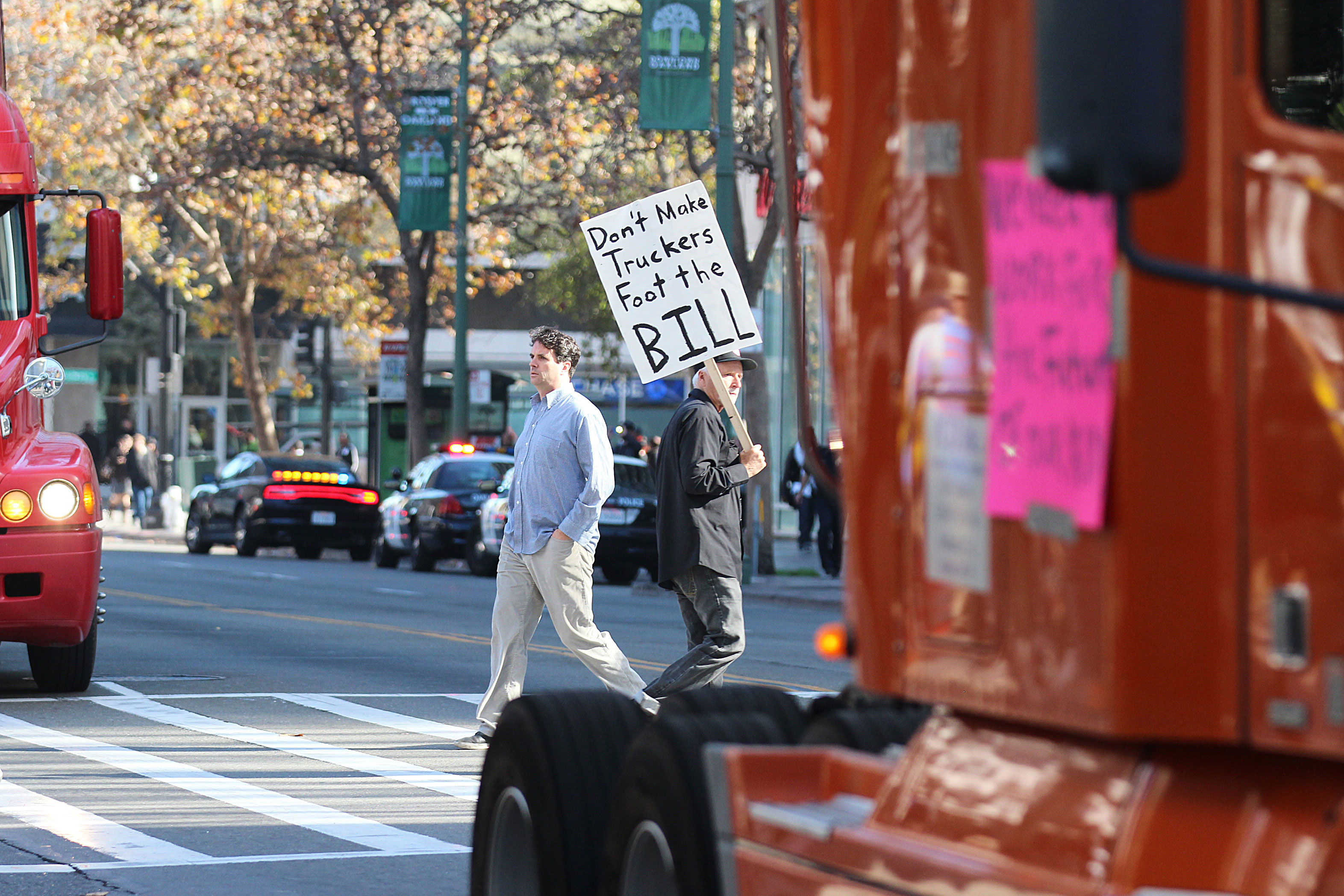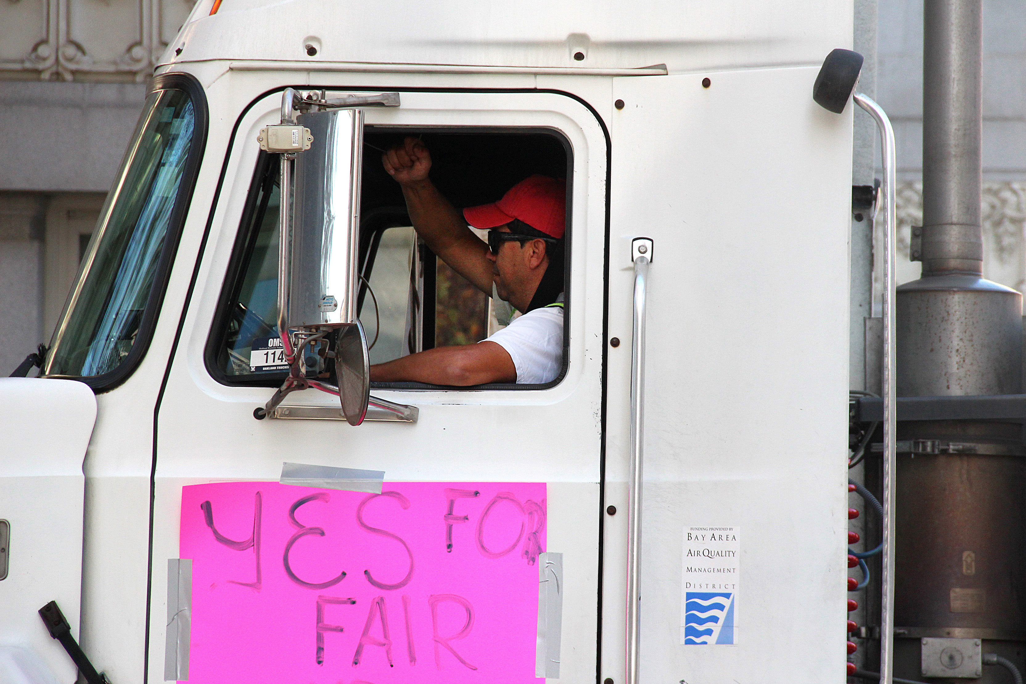 - A passing ambulance, a fire truck and other passing vehicles honked in solidarity as port truckers demonstrated in downtown Oakland. Photo by Terray Sylvester