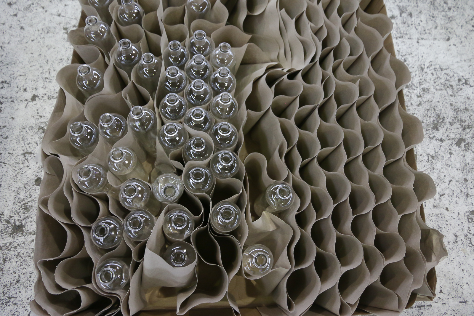- Empty bottles wait to be loaded on a conveyor belt at St. George Spirits in Alameda.