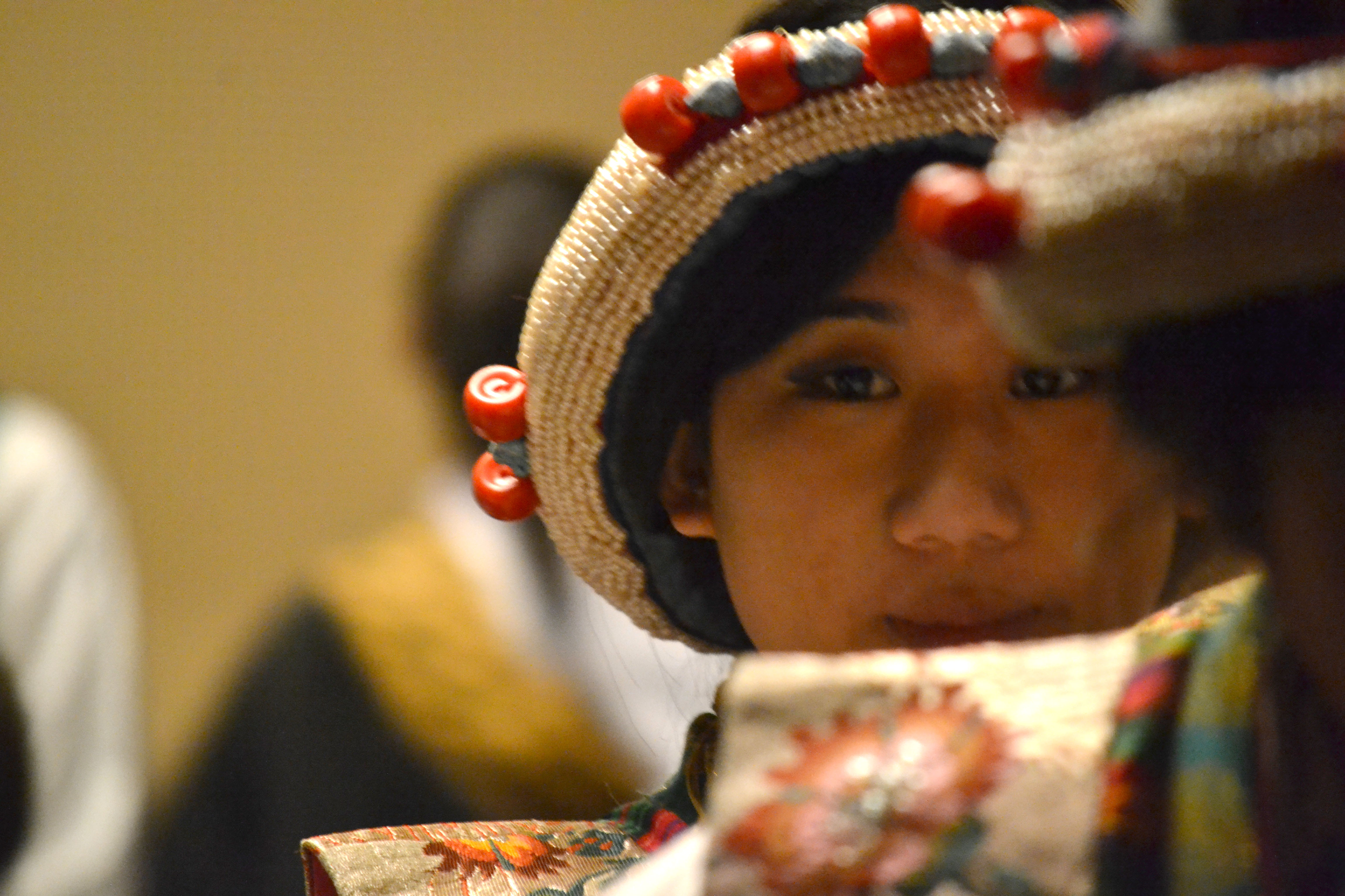 - Tibetan dancers prepare to enter the auditorium before the Dalai Lama arrives in Berkeley. Photo by Nausheen Husain.