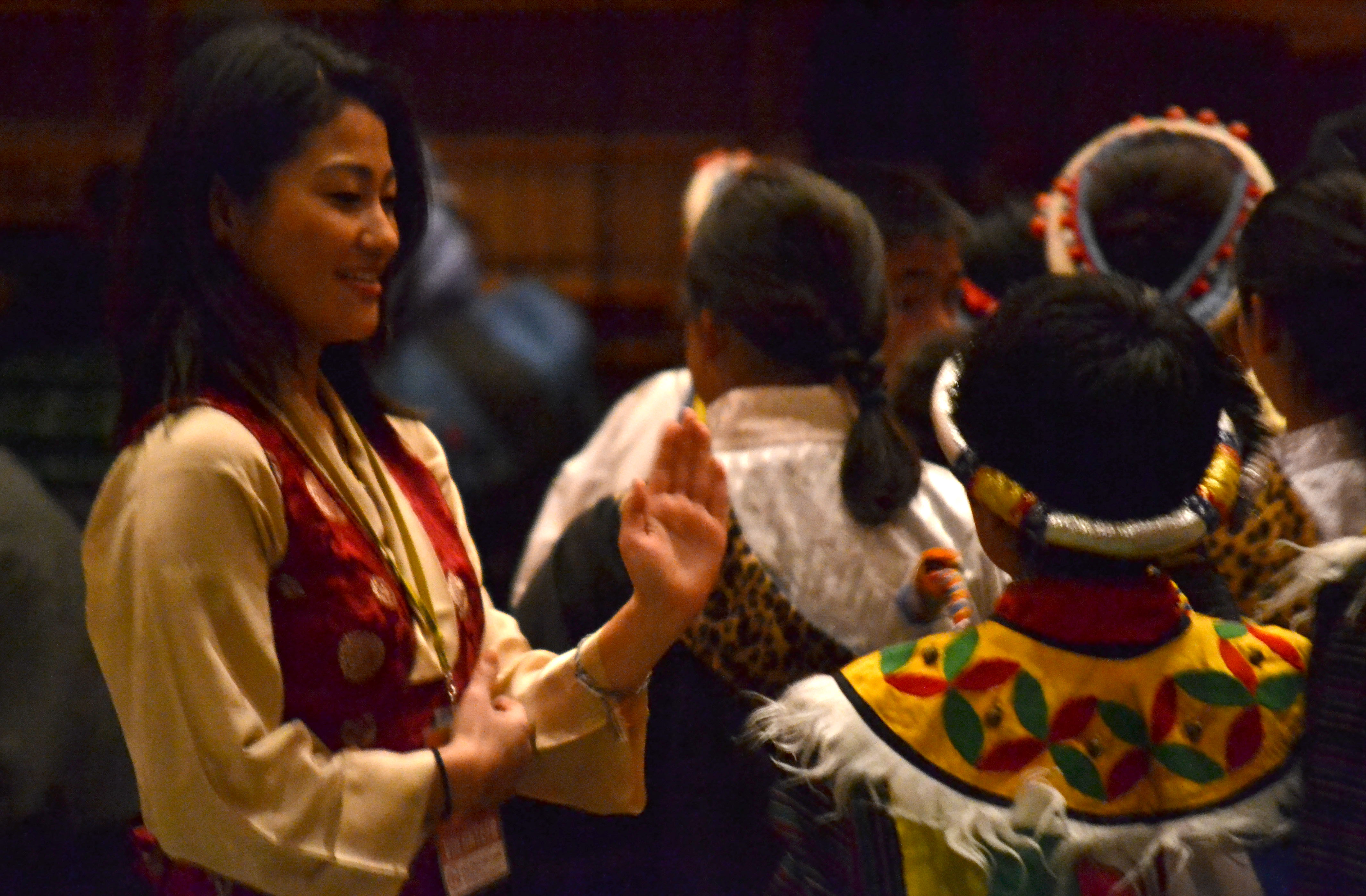 - An usher high-fives a young Tibetan child who will sit at the front of the auditorium, directly in front of the Dalai Lama. Photo by Nausheen Husain.