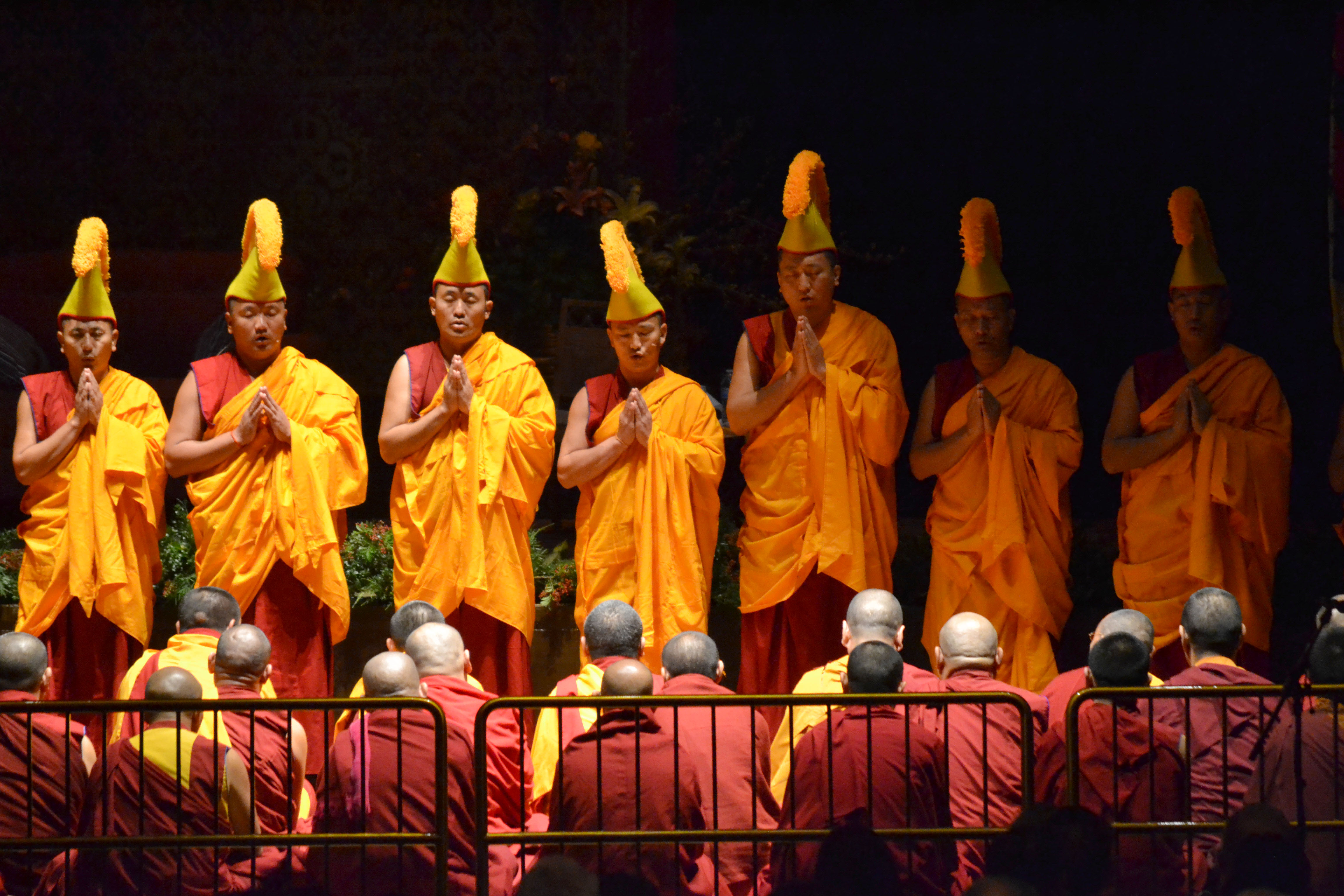 Around 10 a.m., ten Tibetan monks dressed in red and orange robes and wearing tall orange hats took the stage to chant and pray aloud.