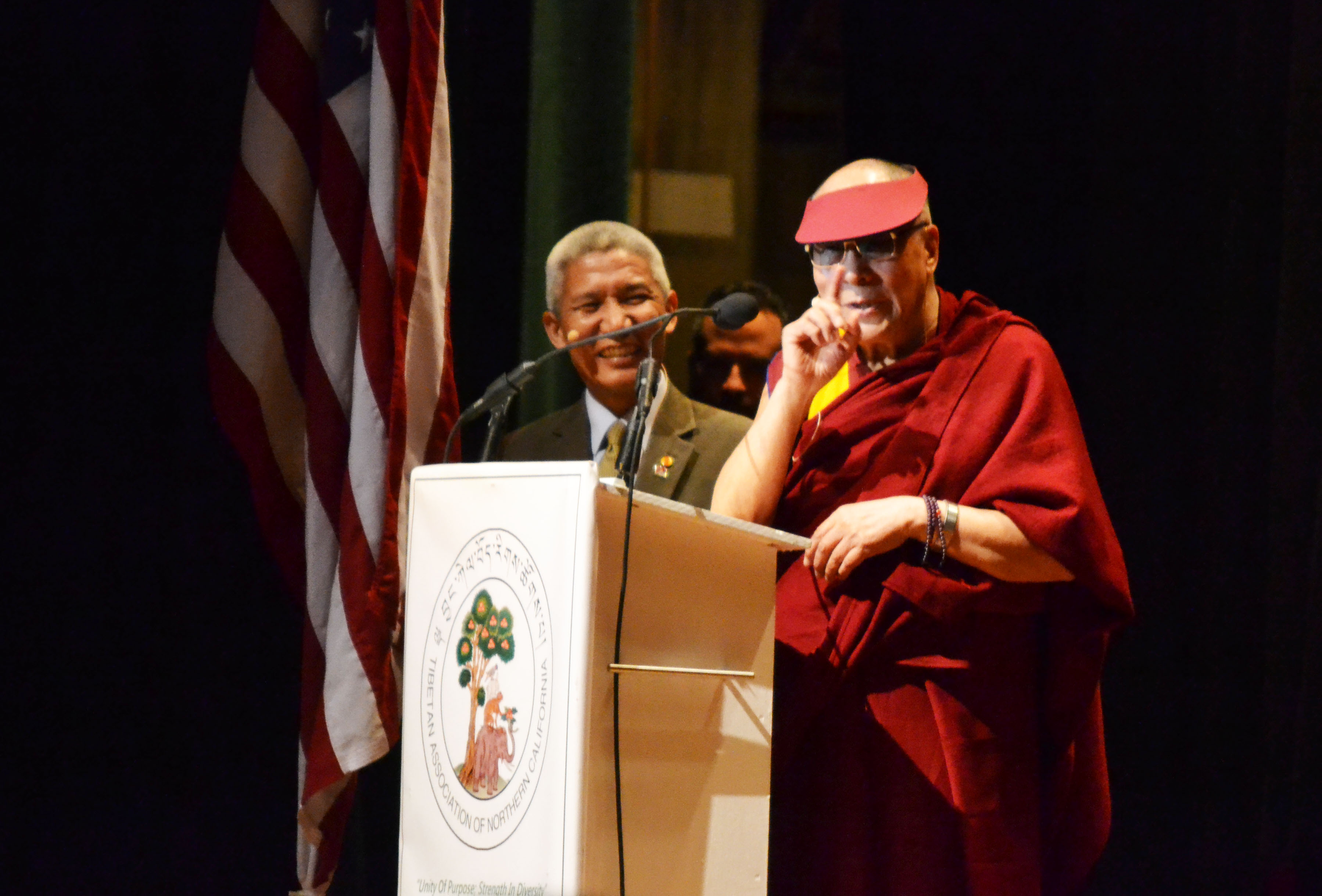 Before arriving in Berkeley to give his talk, the Dalai Lama visited the Tibetan Association of Northern California’s offices and community center in Richmond, where the Richmond Tibetan community was excited to receive him. Incense smoke wafted through the air, and many congregants held out white scarves called khatak.