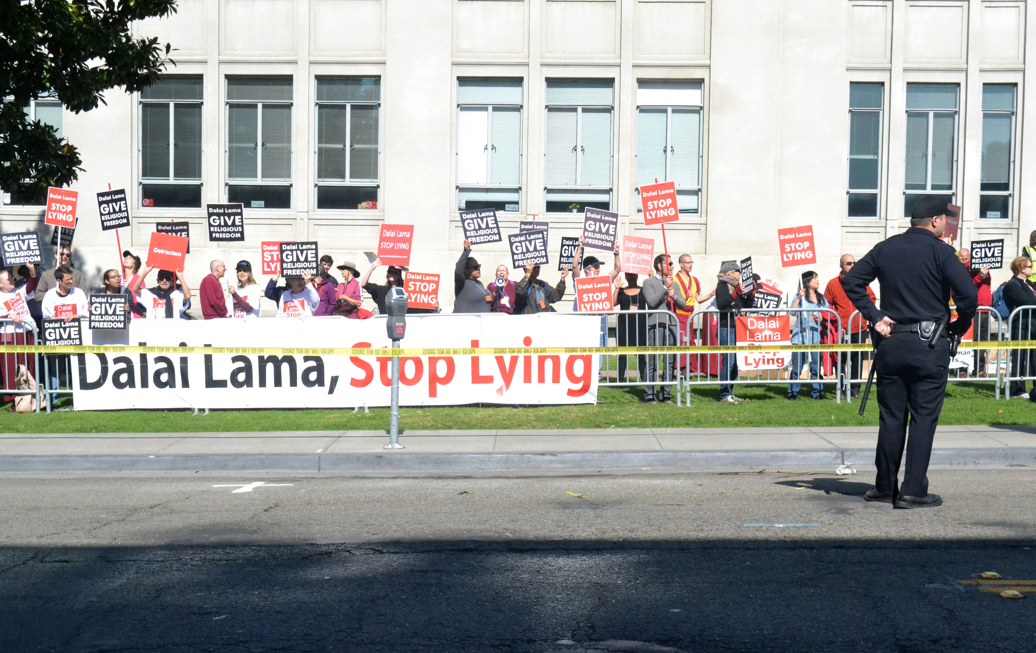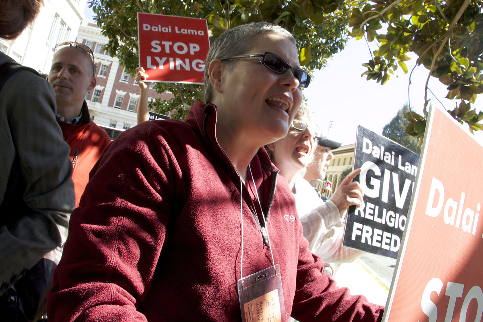 - Protestors from the Shugden Buddhist sect shouted “Dalai Lama, stop lying,” as he left the event in Berkeley. Photo by Sukey Lewis.