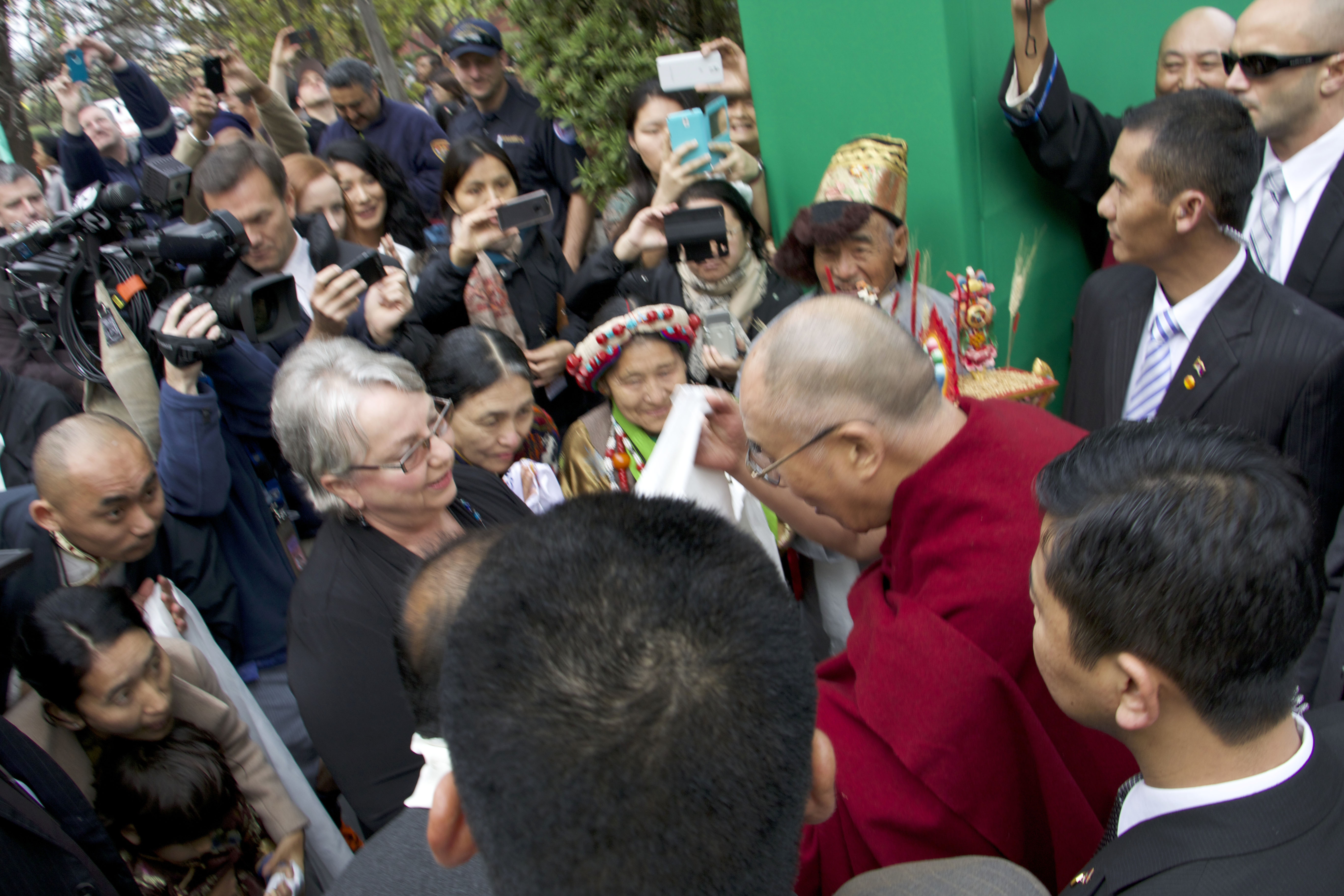 Reporters and security pressed around the Dalai Lama as he walked through the gate and under a welcome banner. Richmond Mayor Gayle McLaughlin greeted the Dalai Lama and presented him with a white scarf.