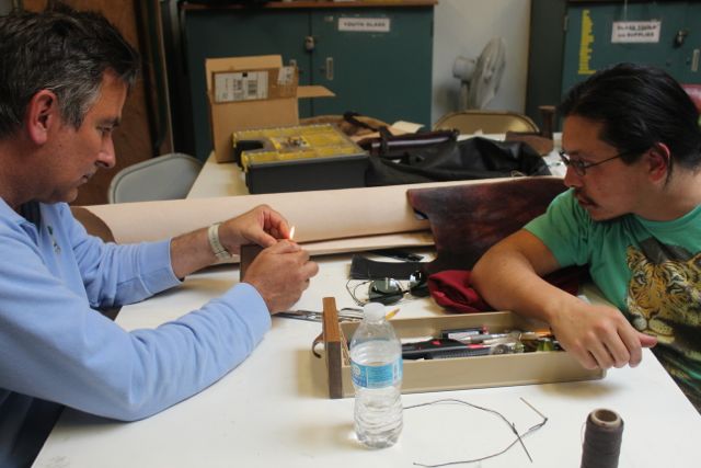 - Sam Waller supervises as one of his student lifts a lighter as a leather crafting technique.