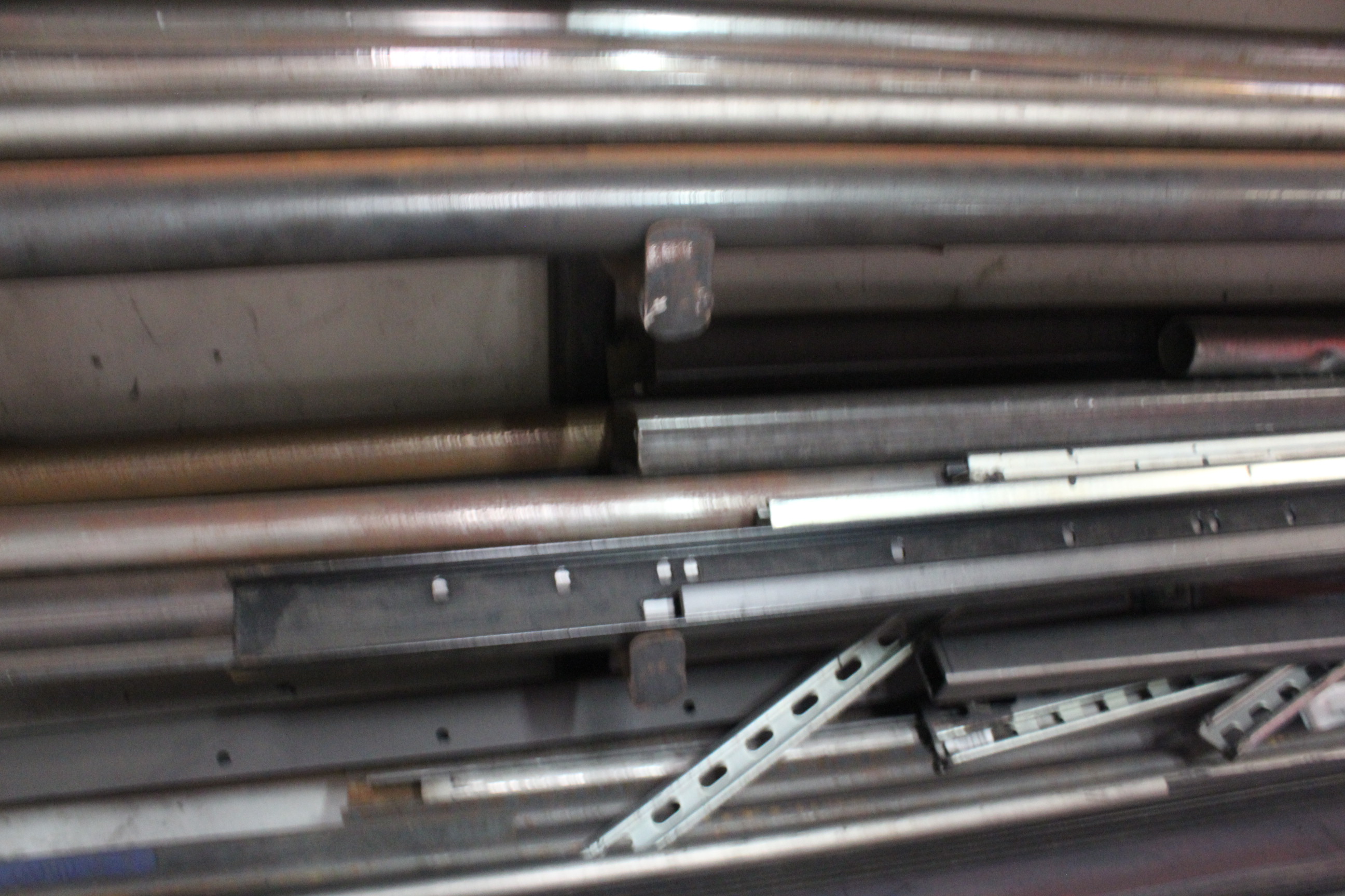 - A shelf of raw materials include recycled tube stocks, and pipe fittings.