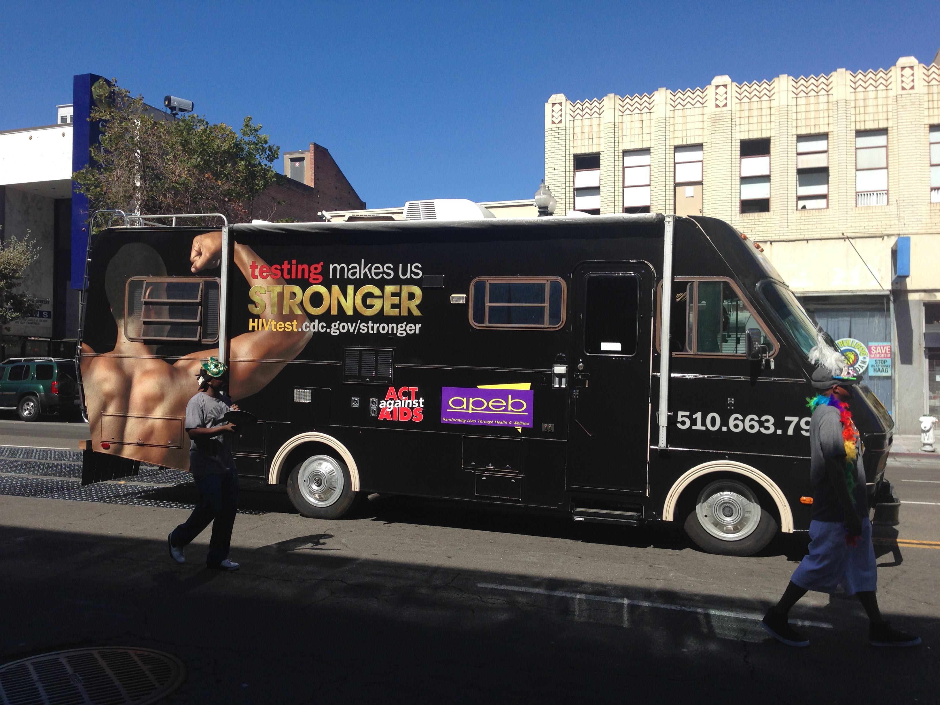 Vendors were both giving away and selling their wares. One business, the Steamworks gym and bathhouse, had a wheel that attendees could spin to win prizes like flashlights and shirts. Wicked Grounds, a San Francisco kink café, offered books, flags, stickers and fetish gear. The San Francisco Goaldiggers, a gay hockey team, sold beer to thirsty festivalgoers, some dressed in hockey gear and some in considerably less. A mobile HIV testing unit offered passersby free testing and HIV information.