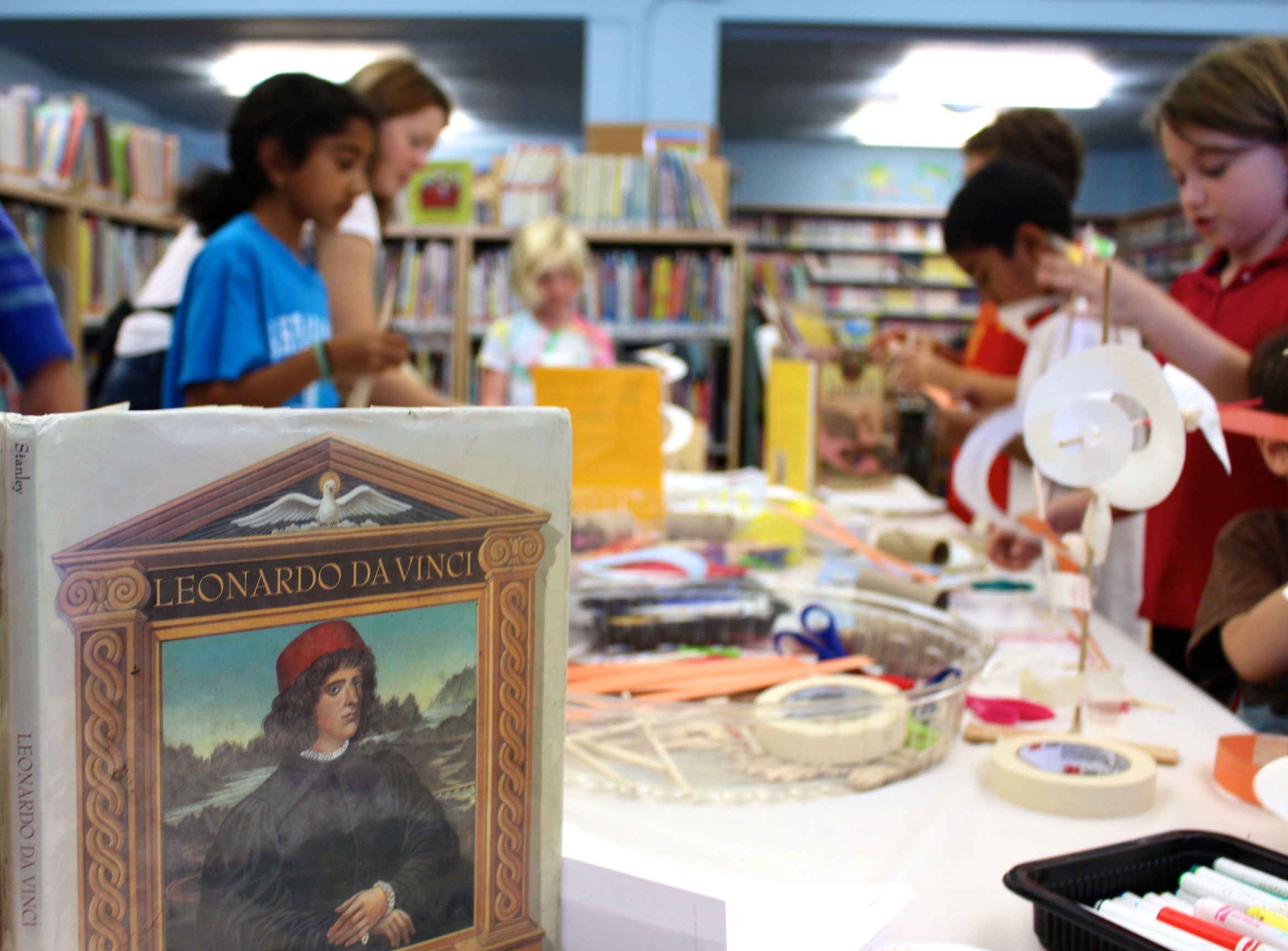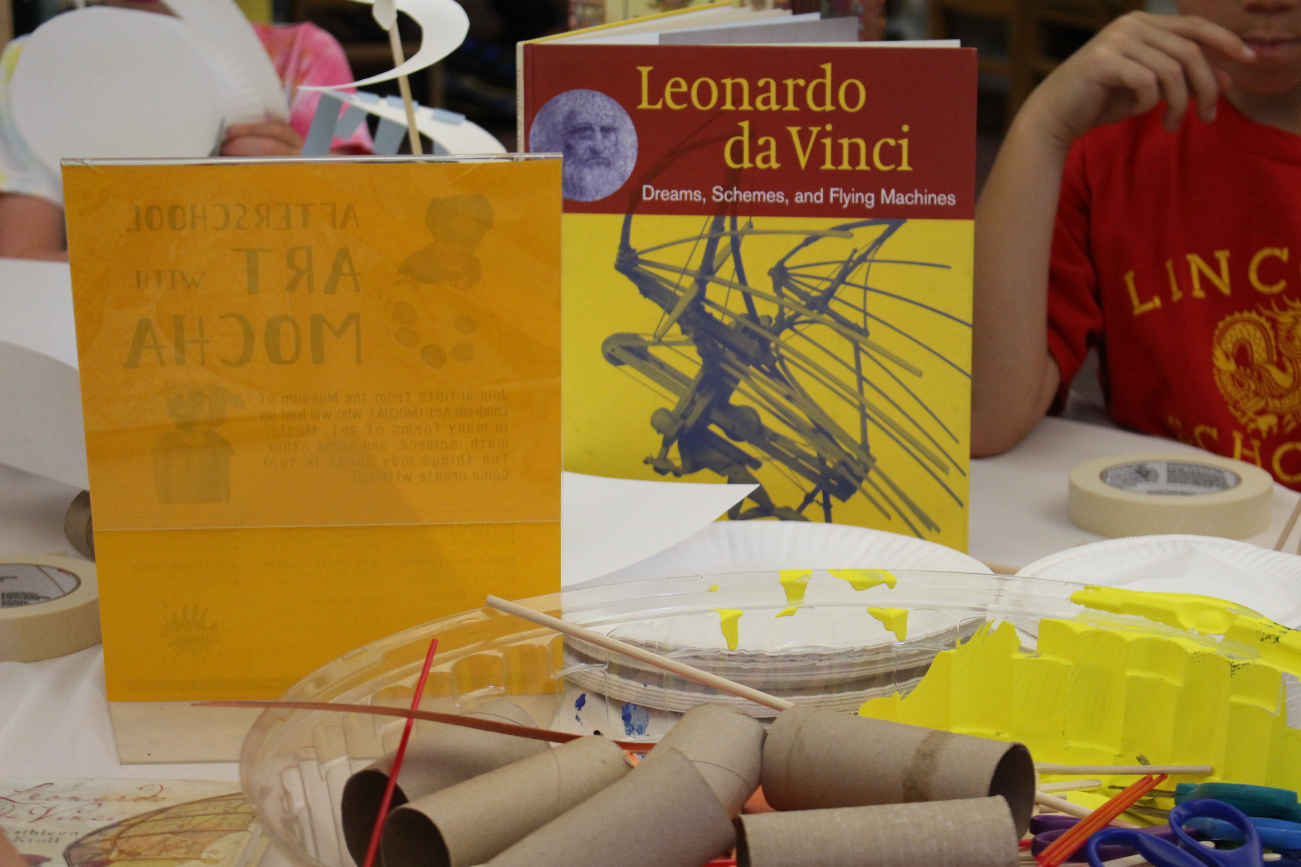 Schnabel looked around to gauge the children’s progress on their flying contraptions, challenging them to channel the Old Master and explore their own designs. While parents assisted the young ones, the older students tested their models and made adjustments to improve upon their creations. Rodriguez’ daughter jumped up from her seat to give her machine a spin. She took a moment to shift the placement of her paper plate coil and tossed her machine up towards the ceiling. “It sort of flies!” she said. “It falls, but it’s pretty when it falls.”