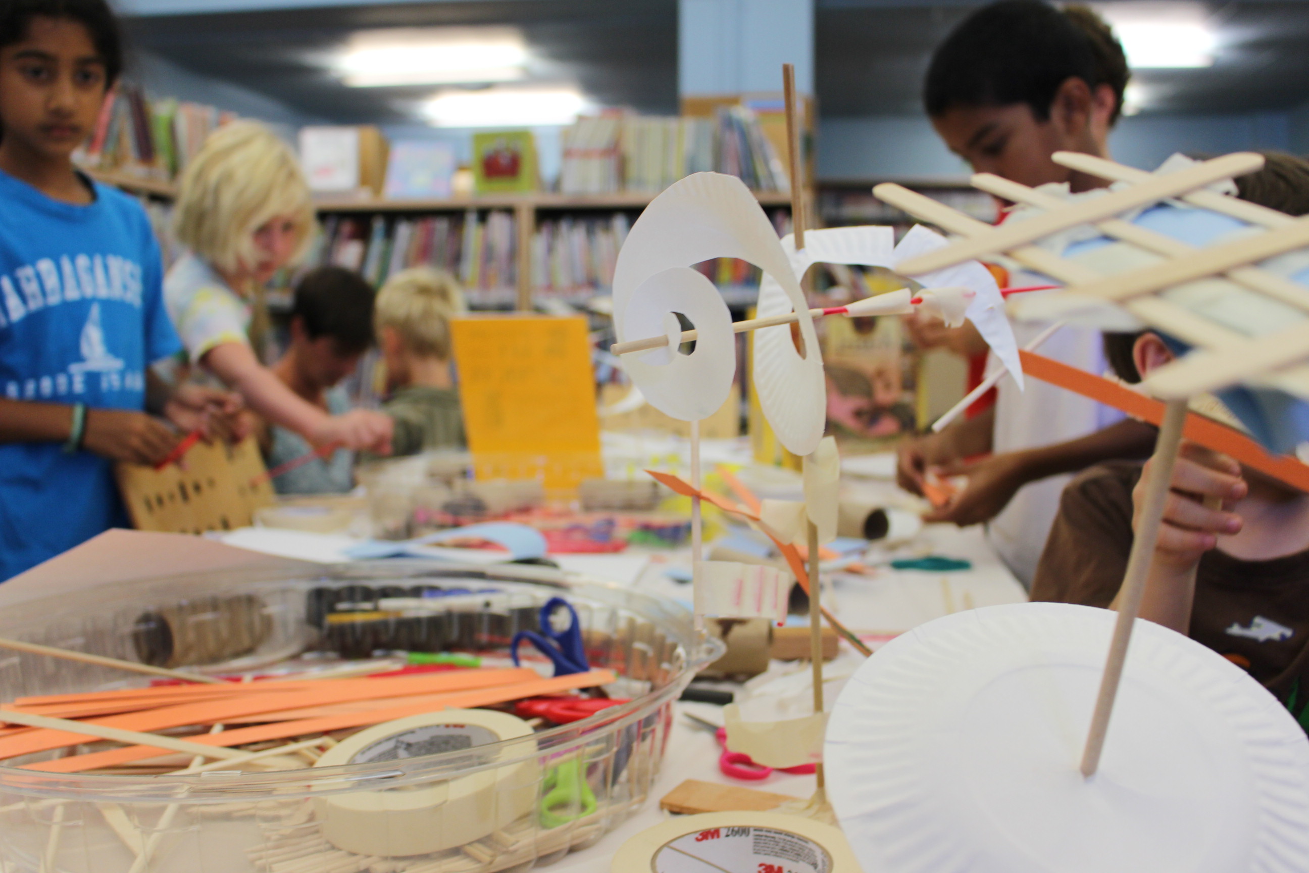 Perplexed, they scanned the rectangular workshop table littered with construction paper, paper plates and Popsicle sticks. Schnabel grabbed a paper plate and began cutting in a circular pattern to demonstrate, creating a coil that she then punctured with a long craft stick. Using masking tape and two toilet paper cartons, she upended her model onto a paper plate base for the children to see.