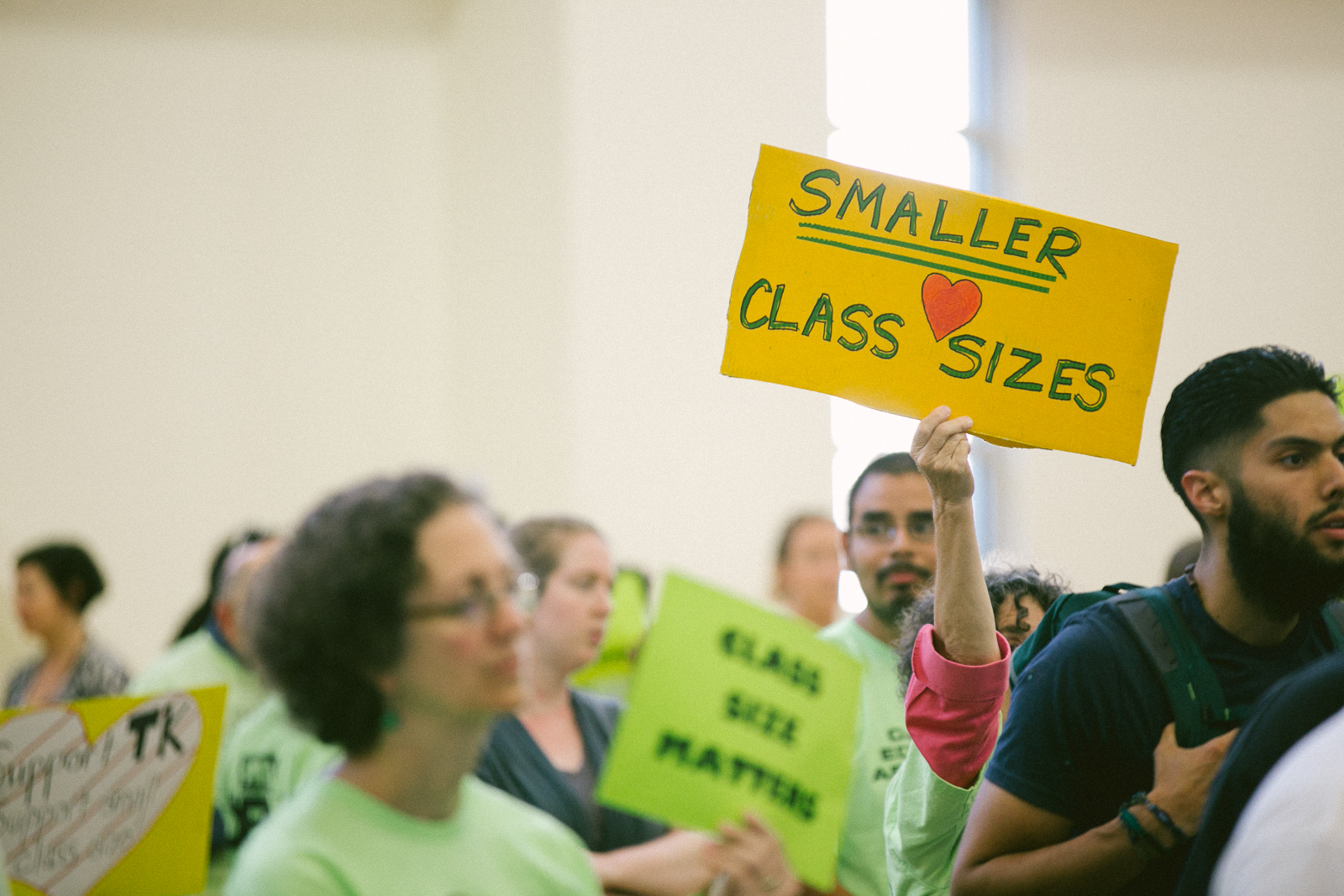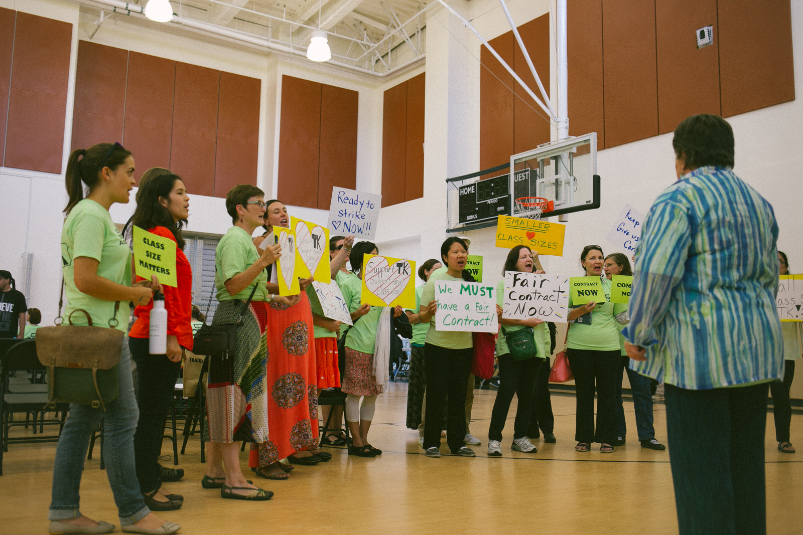 In their bright t-shirts, members of the Oakland Education Association (OEA) crowded into La Escuelita Education Center’s Great Room during the biweekly meeting of the Oakland Unified School District (OUSD) Board of Education. Board members did their best to continue business as usual amid a noisy crowd demanding reduced class sizes and salary increases. But when a “contract now!” chant became too loud for regular conversation, the board retreated into an unexpected recess.