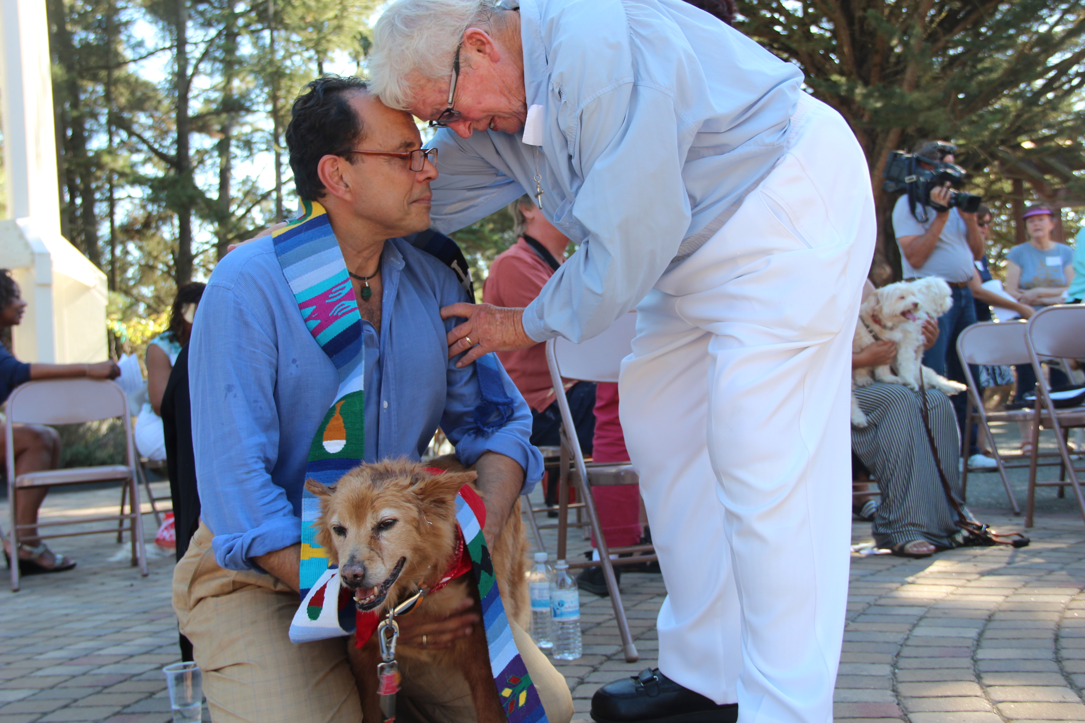 - Rhea Babbitt blesses a dog and its owner. “I tell people that I found the dog,” the owner said, “but really she found me.” Photo by Sanosi Osman.
