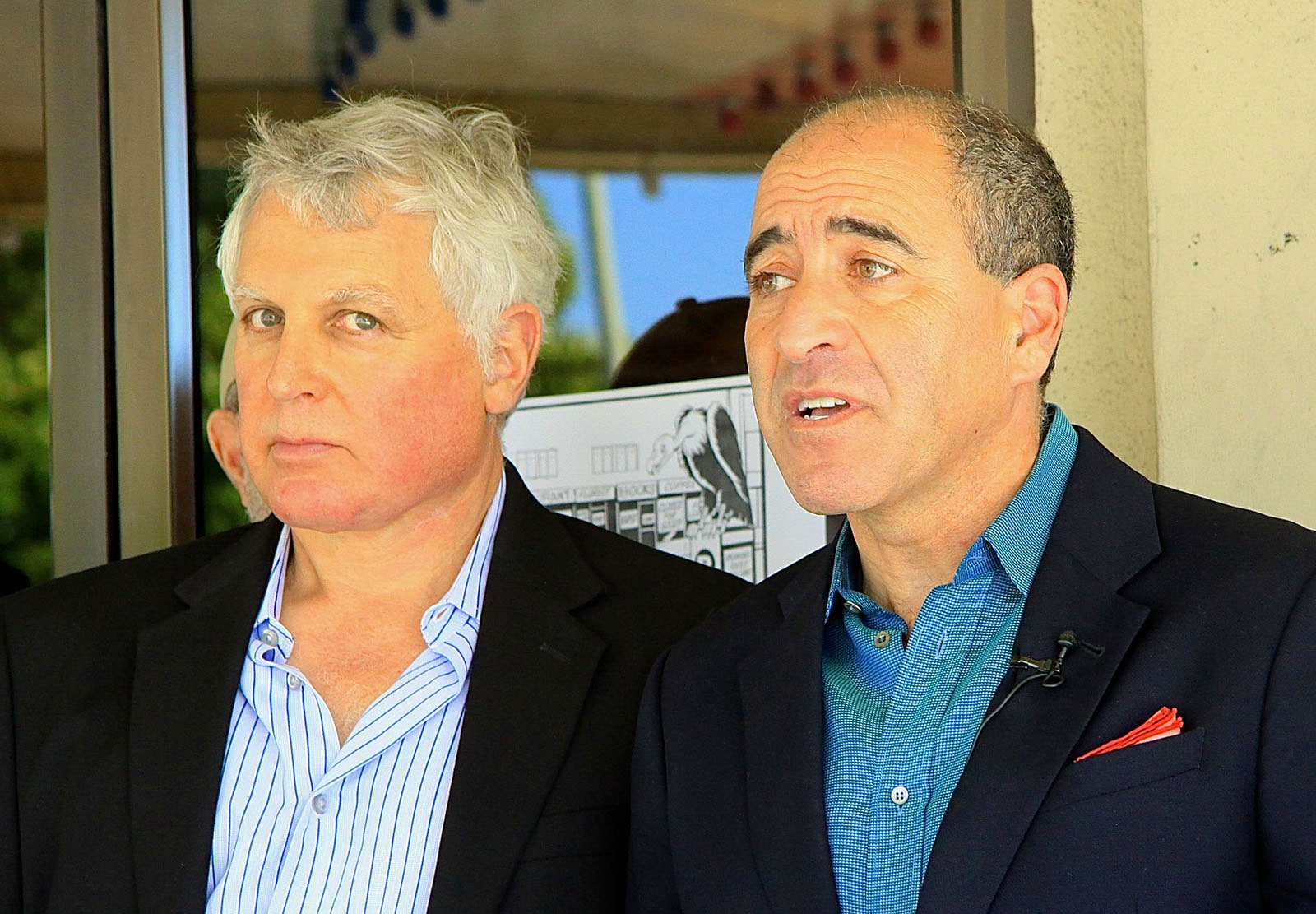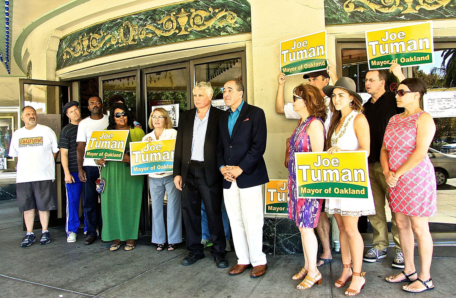 - Surrounded by supporters, mayoral candidate Joe Tuman stands side by side with Grand Lake Theatre owner Allen Michaan (left) to announce his proposal to reduce parking meter fees and violation fines.