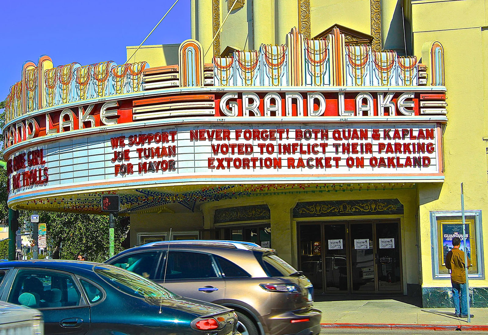 During Friday’s scorching heat, the Grand Lake Theatre marquee displayed its own heated message: NEVER FORGET! BOTH QUAN & KAPLAN VOTED TO INFLICT THEIR PARKING EXTORTION ON OAKLAND. Beneath it, mayoral candidate Joe Tuman joined Allen Michaan, the theatre’s owner, and other local business owners and employees who came out to support Tuman’s proposal for a newfangled parking plan.