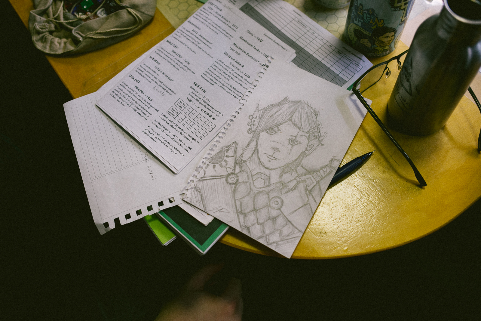 Thomas puts on her serious, Game Master face and reveals that Skyler’s as-yet-unnamed character came across an injured animal as a child. He poked the animal with a stick (which seems harmless enough), but in Baluud—a land in Abantey in which all life is considered sacred—it was a terrible, defining moment. As a result, the other citizens of Baluud watched him closely for his entire childhood.