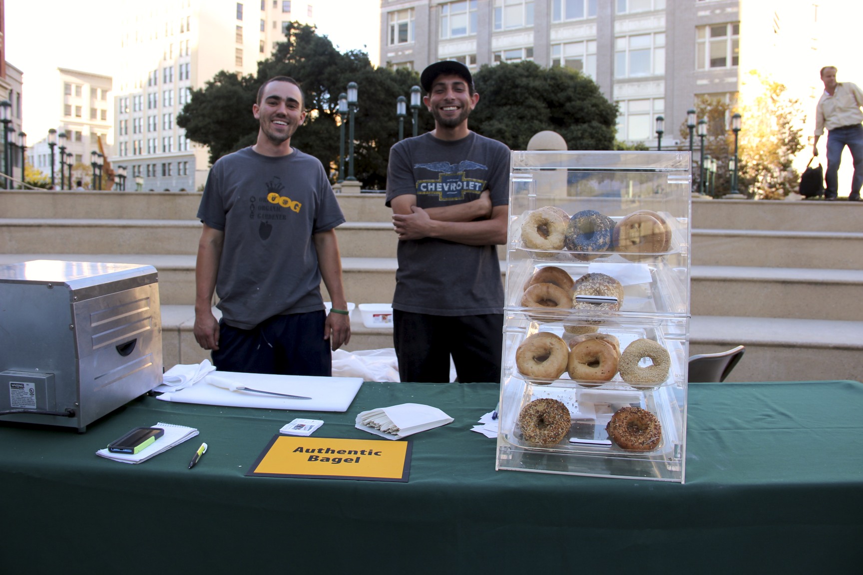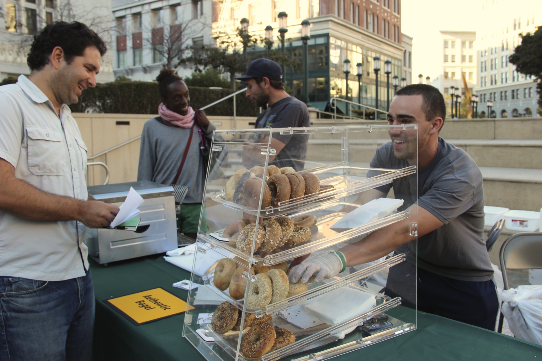 Schaaf chose plain and handed $3 to Scott, who wore a baseball cap and t-shirt. The two chatted like old friends as Schaaf’s bagel disappeared into a revolving toaster oven that Scott had brought to the plaza.
