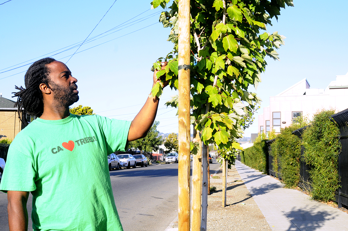 - Kevin Jefferson, Program Manager of Urban Releaf, is looking at the trees the organization planted with students from New Highland Academy last year in East Oakland.