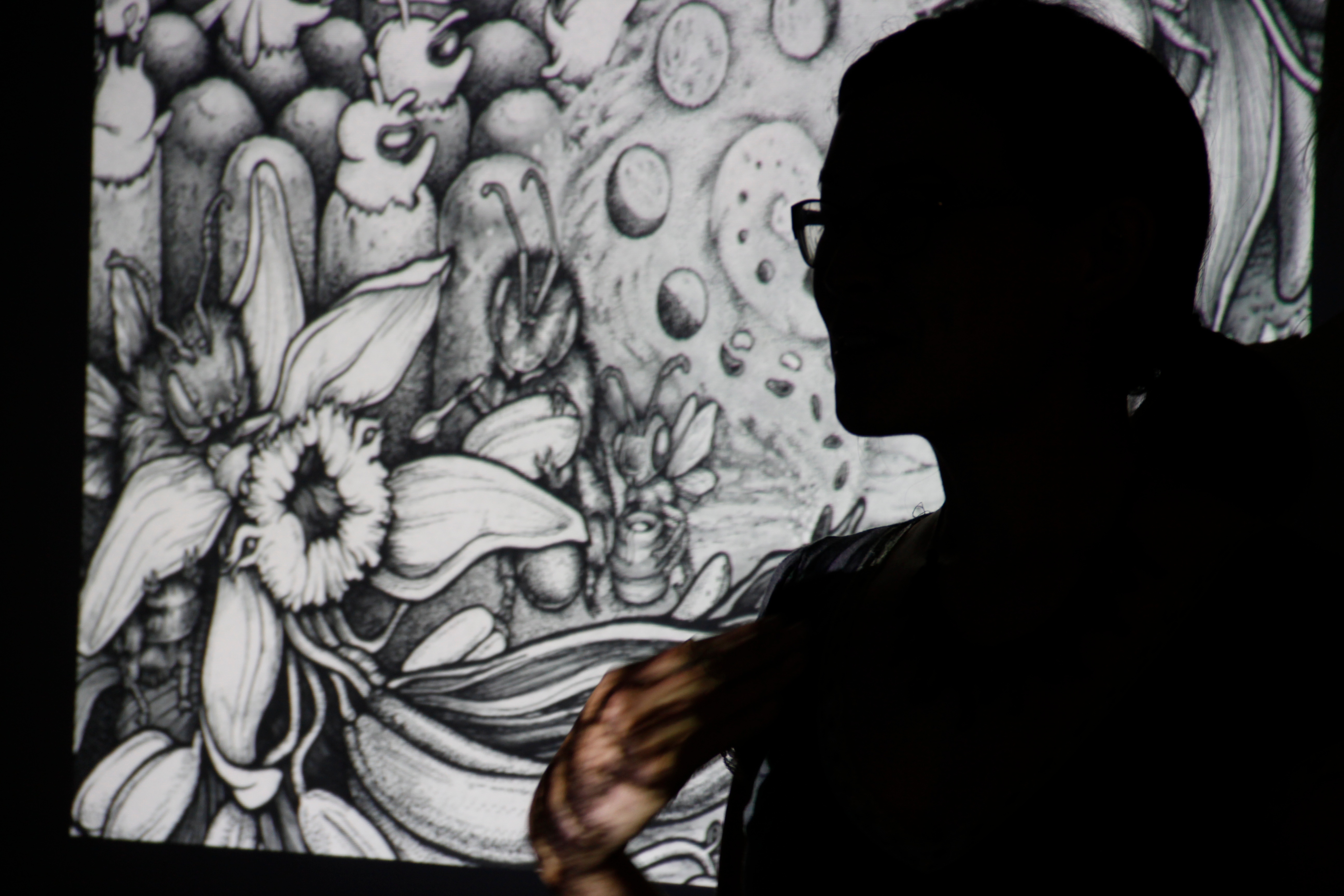As tall and wide as a movie screen, “Mesoamerica Resiste” is an intricate black and white allegory depicting the battle between resource-extracting corporations and the indigenous people of Southern Mexico and Central America. The similarly sized “True Cost of Coal,” also displayed Wednesday night, shows a history of mineral and human exploitation in Appalachia, and folds, like a Mad Magazine Fold-In, to erase what Saunders calls “a 250-year blip of short-sighted thinking,” from the early days of Cherokee eviction to modern mountaintop removal.